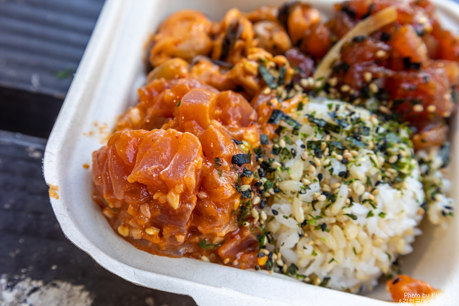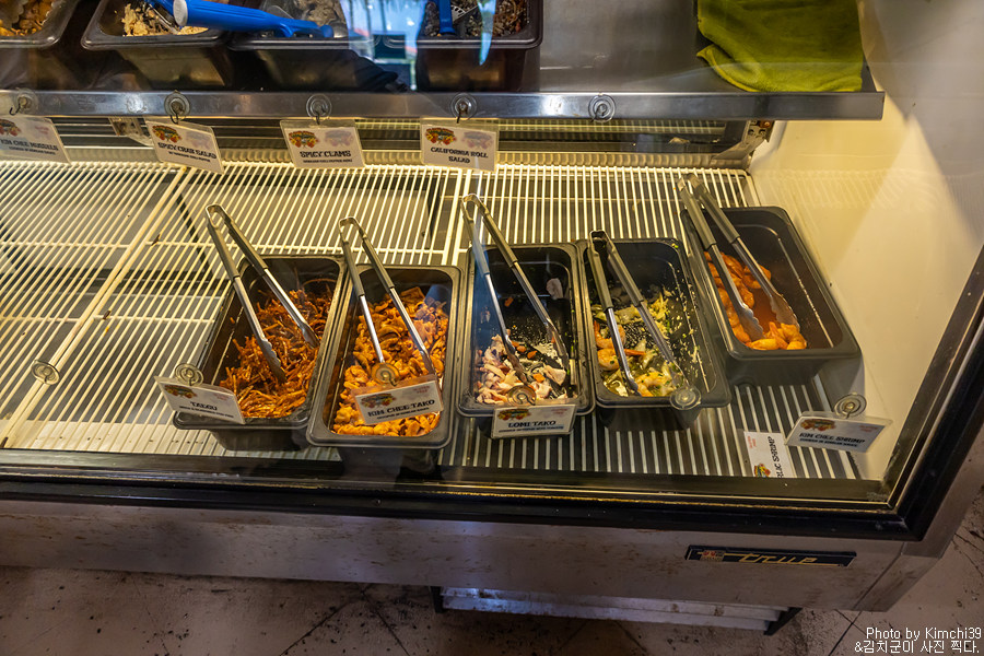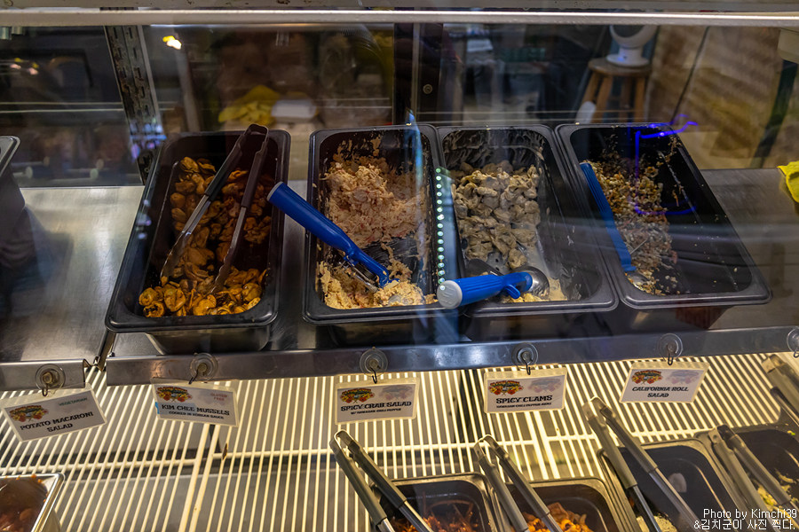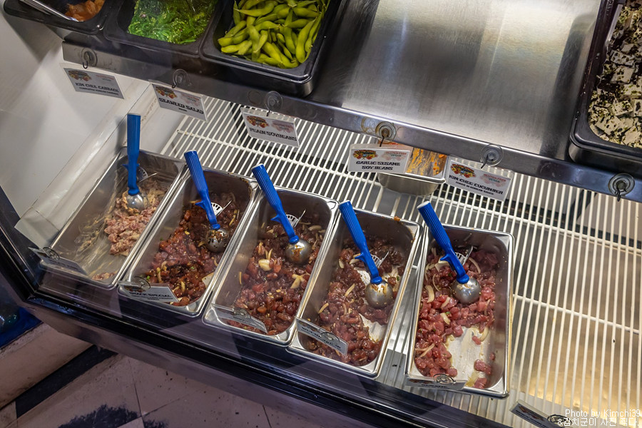 포케와 반찬들. 아래쪽의 포케 2가지와 반찬 하나를 고르면 된다. 가장 인기 있는 것은 미역 샐러드(Seaweed Salad)지만, 나는 홍합을 택했다. 미역 샐러드도 이전에 먹어봤는데, 나름 꽤 맛있다. 개인적으로는 홍합을 좋아해서 골랐는데, 포케도 자극이 강한걸 골라서 미역 샐러드로 하는게 나았을까 싶기도 했다. 의외로 에다마메를 고르는 사람들도 많은 편.