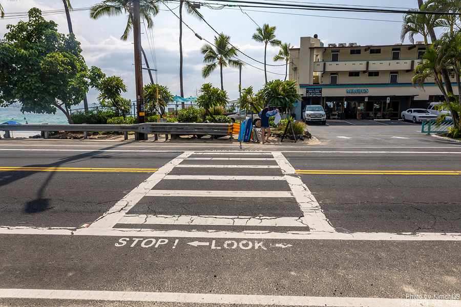 주차장에서 나오면 바로 횡단보도다. 왕복 2차선이기도 하고, 하와이는 횡단보도에 사람이 서 있으면 잘 멈춰주기 때문에(최소한 이웃섬들에서는) 손쉽게 횡단보도를 건널 수 있다.