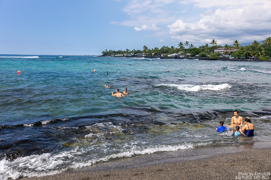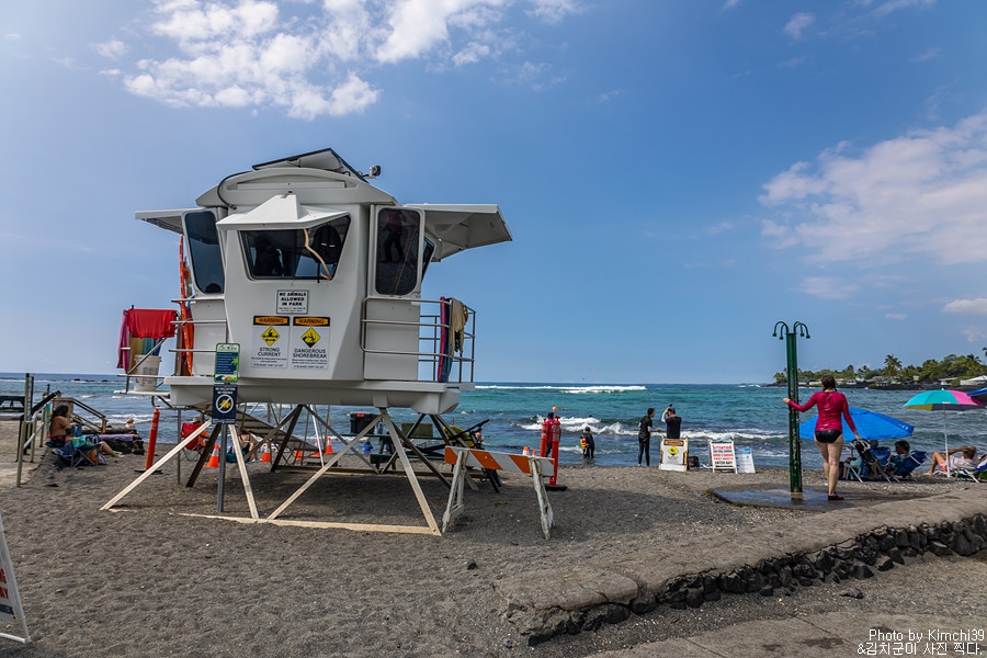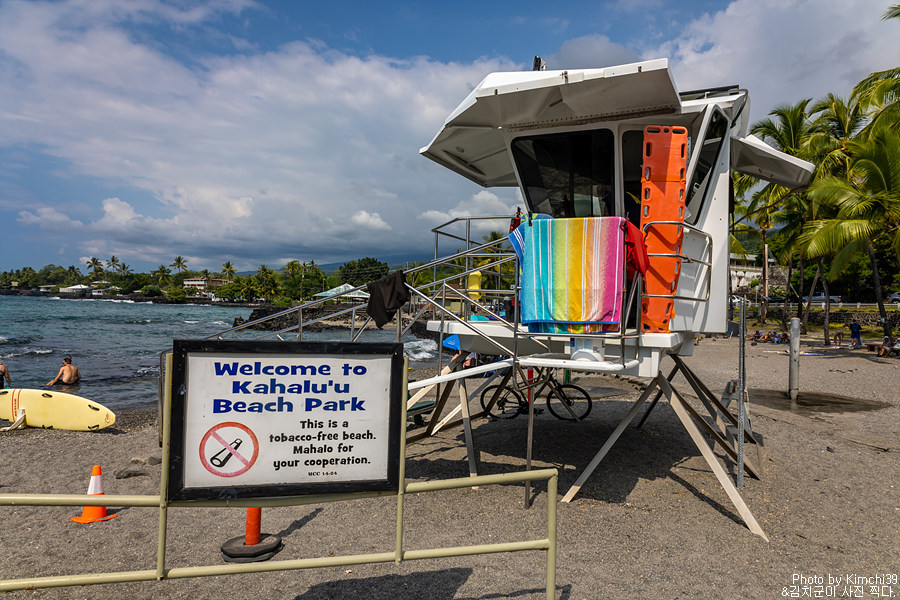 카할루우 비치파크에는 라이프가드가 있어서 안전하게 물놀이를 즐길 수 있다. 이날은 다소 파도가 있는 날이었는데, 해변에서 조금 떨어진 곳은 파도가 심하지 않아서 스노클링을 하는데에는 문제가 없어보였다. 빅아일랜드의 경우 다른 섬들과 다르게 가장 젊은 곳이다보니 모래사장이 있는 해변이 드물다. 카할루우 비치파크의 경우에는 굵은 검은색 모래가 있기는 하지만, 그래도 어느정도 해변이 있고 조금 멀리까지 나가도 그렇게 깊지 않아서 스노클링을 하기에 좋다. 이날은 스노클링 장비가 없어서 스노클링을 하지는 못했지만, 이후에 스노클링 장비를 사서 스노클링을 할 수 있었다.