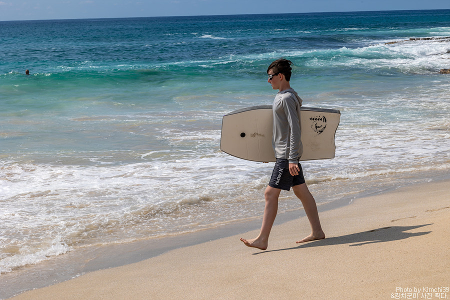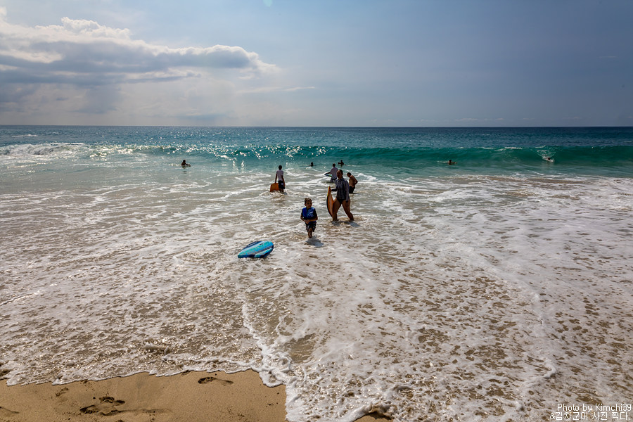 사람들이 화이트 샌드 비치라고 부르기도 하지만, 사실은 아주 고운 황금빛 모래가 있는 해변이다. 재미있는 것은 큰 차이는 아닐지라도 바다에 가까울수록 모래의 샑이 더 밝아지는데, 그래서 화이트 샌드 비치라는 이름이 붙었는지도 모르겠다. 해변과 가까운 곳에 커다란 야자나무가 몇개 있고, 그 아래 사람들이 자리를 잡고 있었다. 이 곳은 해변 앞에 파도를 막아줄만한 바위들이 없어서, 파도가 다소 높다. 그래도 파도를 즐기면서 해변놀이를 하기에는 꽤 좋다.