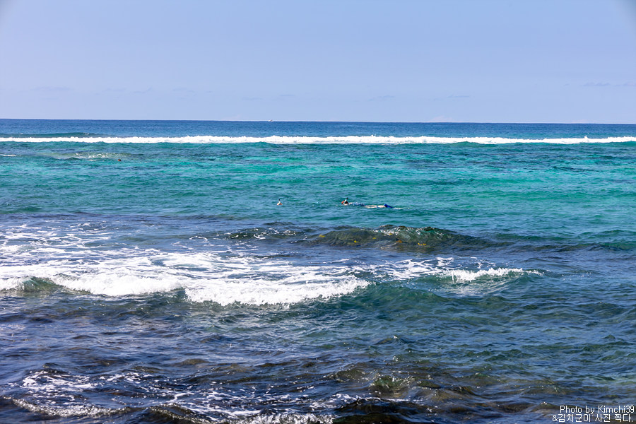 카할루우 비치 파크에서 스노클링을 즐기는 사람들. 해변 가까운 곳은 파도가 좀 있었지만, 산호들이 있는 다소 먼 곳은 나름 스노클링을 즐길 수 있는 수준이었다. 물론, 이렇게 파도가 좀 있는 날은 초보들은 스노클링을 하기 어렵고, 가능하면 파도가 거의 없는 날을 고르는 것이 좋다.
