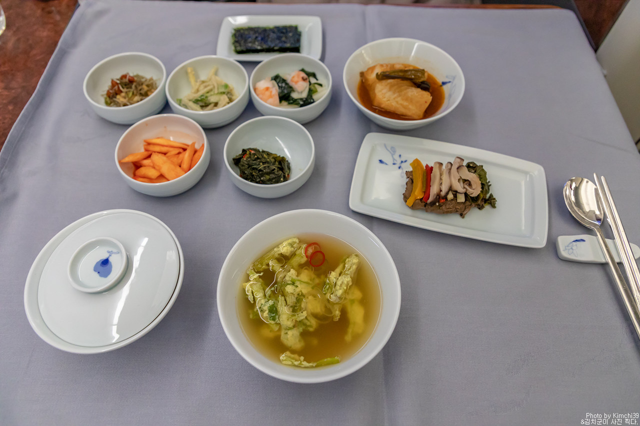 이렇게 해서 완성된 한식 정찬. 테이블이 너무 커서인지 좀 횡해보이긴 한다. 어차피 먹고 모자라면 다른 식사를 주문할 수 있기 때문에 사실 퍼스트클래스에서 부족함이라는 단어는 어울리지 않지만 말이다.
