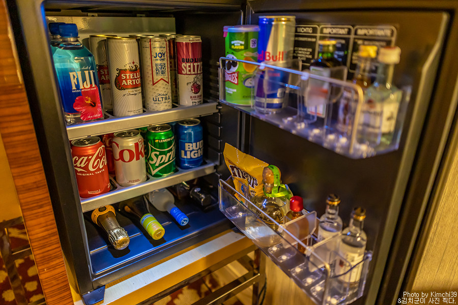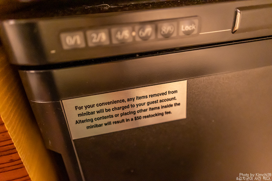 라스베가스 호텔에서는 무료를 기대하면 안된다. 냉장고(미니바)에는 음료들이 가득 들어가 있으며 이 음료들은 센서로 측정된다. 그렇기 때문에 마시지 않았더라도 들기만 하면 그냥 비용이 부과된다. 사진에서 보이는 것처럼 음료를 마시는 것 외에도 개인적인 다른 물건을 냉장고에만 넣어도 센서를 건드려 $50 이 추가될 수 있다고 경고하고 있다. 결국, 라스베가스에서는 그냥 냉장고는 포기하는 것이 낫다. 호텔에 따라서는 요청하면 별도의 냉장고(당연히 추가비용)를 가져다 주기도 한다.