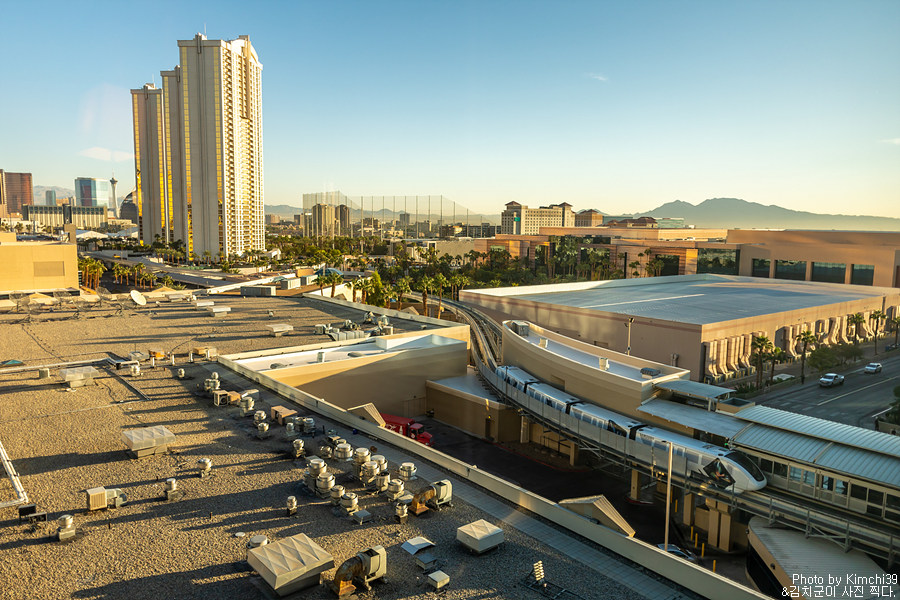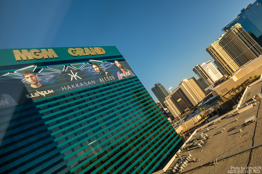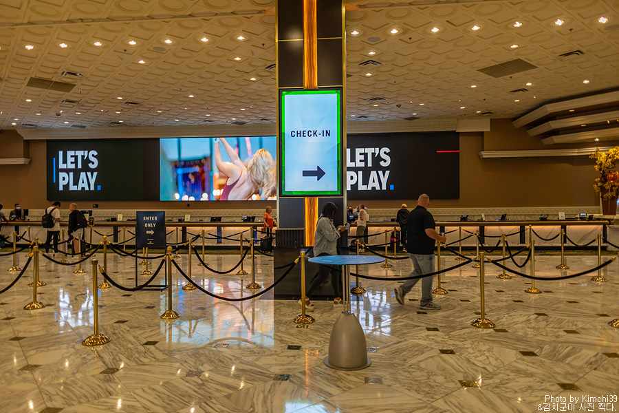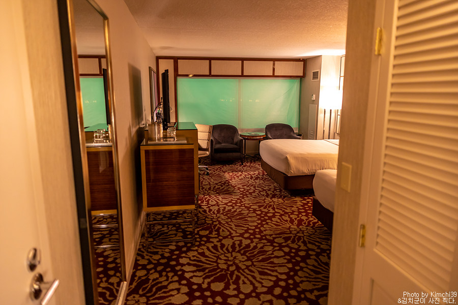 체크인 카운터. 다소 늦은시간이어서 그런지, 체크인하는 사람들이 그리 많지 않아서 수속은 생각보다 빠르게 진행할 수 있었다. 저렴하게 예약했던거라 객실에 대해서는 크게 기대하지 않았었는데, 나름 객실도 크게 나쁘지 않았다. 밖으로 MGM그랜드호텔의 조명 눈뽕이 좀 있었던 걸 빼면.