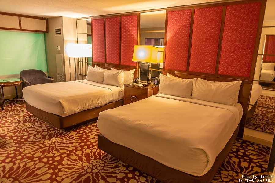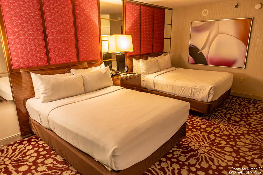 혼자 여행할 때에도, 가격차이가 없다면 2베드가 있는 객실을 선호하는 편이다. 간단한 물건들을 침대위에 펼쳐놓고 정리할 수 있어서 공간활용에 좋기 때문. MGM 그랜드 호텔의 객실에는 2개의 퀸사이즈 베드가 있었는데, 침대도 상당히 좋고 침구나 전체적인 분위기도 깔끔했다. 다만, 창문에서 보이는 것처럼 바깥의 조명이 너무 밝아서 암막을 치지 않고서는 잠잘 수 없다는게 흠이었지만.