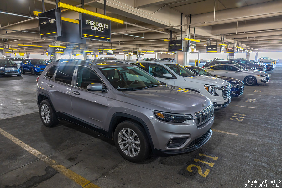 허츠 렌터카의 경우 미드사이즈 이상을 빌리면, 골드 회원 섹션을 이용할 수 있다. 보통 가장 기본 등급인 골드회원 섹션에는 미드사이즈/풀사이즈 차량이 있는데.. 종종 운이 좋으면 SUV가 있는 경우도 있다. 사진에 보이는 것처럼 대부분이 세단인 와중에 지프 컴패스(미드사이즈SUV)가 한 대 있어서 이 차량으로 선택을 했다. 다만, 차를 인수하고 나간 후에야 앞유리에 크랙이 있다는 것을 발견해서, 다음날 아침 다시 차를 교환하러 와야 했으니 그리 좋은 선택은 아니었지만.