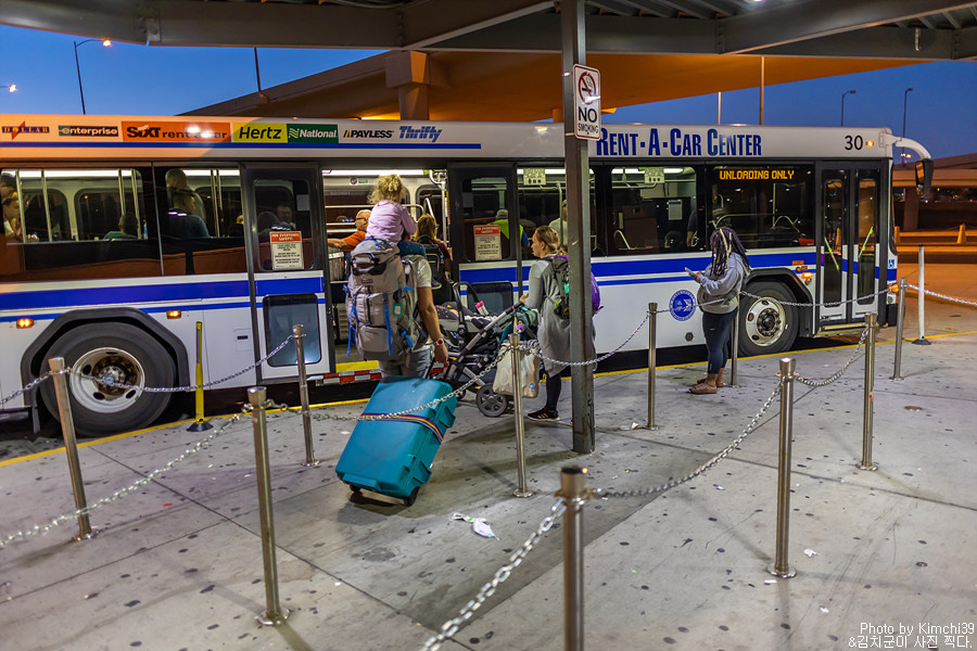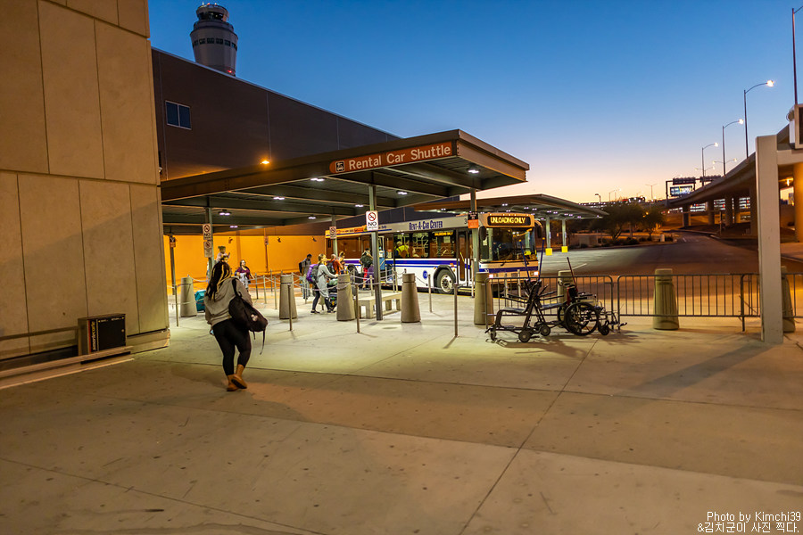 라스베가스 국제공항의 짐 찾는 곳에서 나오면, 렌터카 셔틀(Rental Car Shuttle)이라고 쓰여진 곳이 나왔다. 이 곳에서 셔틀버스를 타고 렌터카 센터로 이동했다. 라스베가스 공항의 모든 렌터카 회사는 이 렌터카 센터에 있는데, 이 센터에 없을 정도라면 정말 소규모 업체이므로 이용하지 않는 것을 추천한다. 보통 운전기사에게 팁을 주지 않지만, 짐을 싣는 것을 도와줄 경우에는 조금 팁을 주기도 한다. 팁 주는 것은 사람마다 케바케.