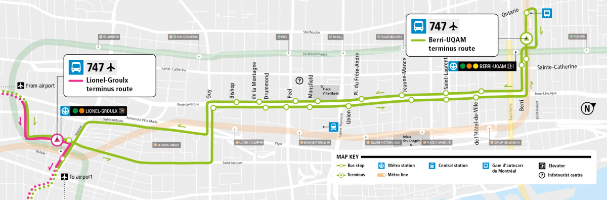 몬트리올 국제공항 행 747 버스 루트. 몬트리올의 중심가를 거의 다 지나간다고 봐도 무방하다.
