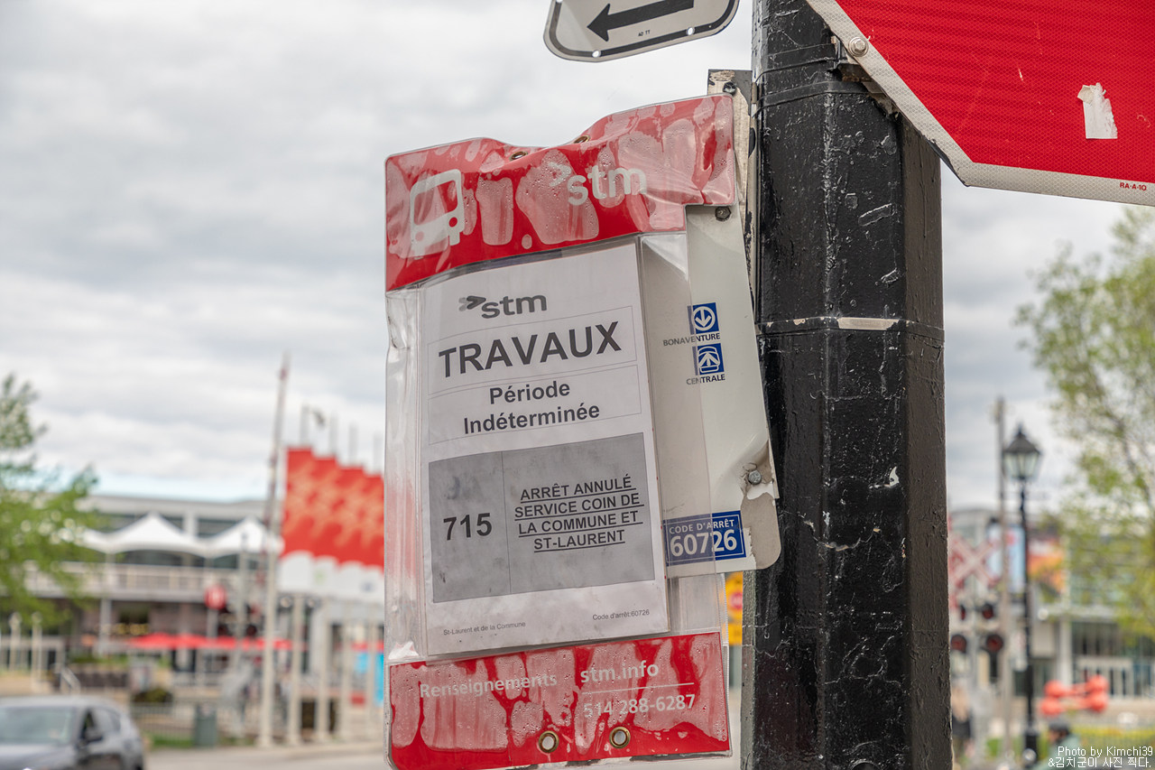 그리고, 지난 번 퀘벡시티에서도 그랬듯이, 몬트리올도 곳곳이 공사중이었다. 공사중의 여파는 버스 정류장에도 미쳐서, 이렇게 버스가 서지 않는 정류장들도 꽤 있었다. 영어 없이 불어로만 써있기 때문에 구글 번역을 통해서야 결국 이게 버스가 임시 중단이라는 것을 알았다. ㅠㅠ
