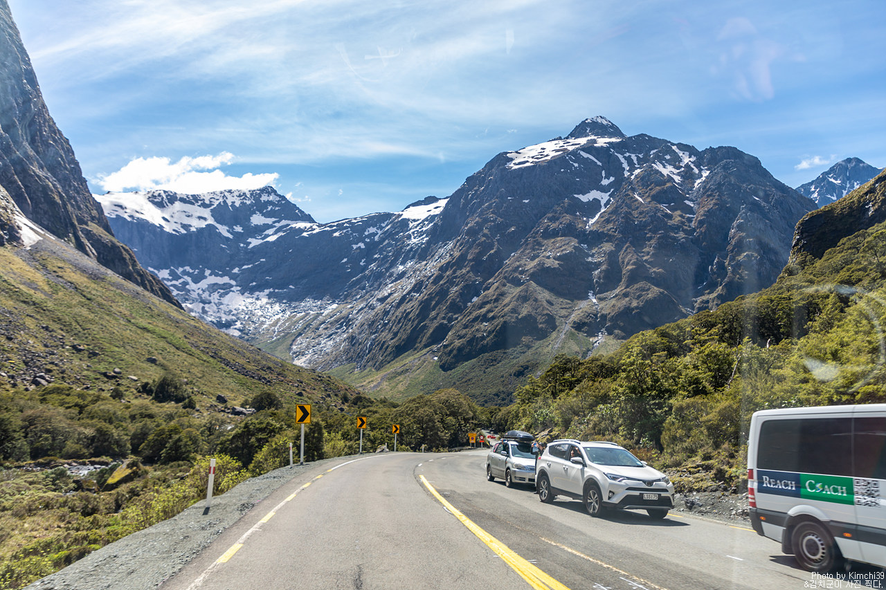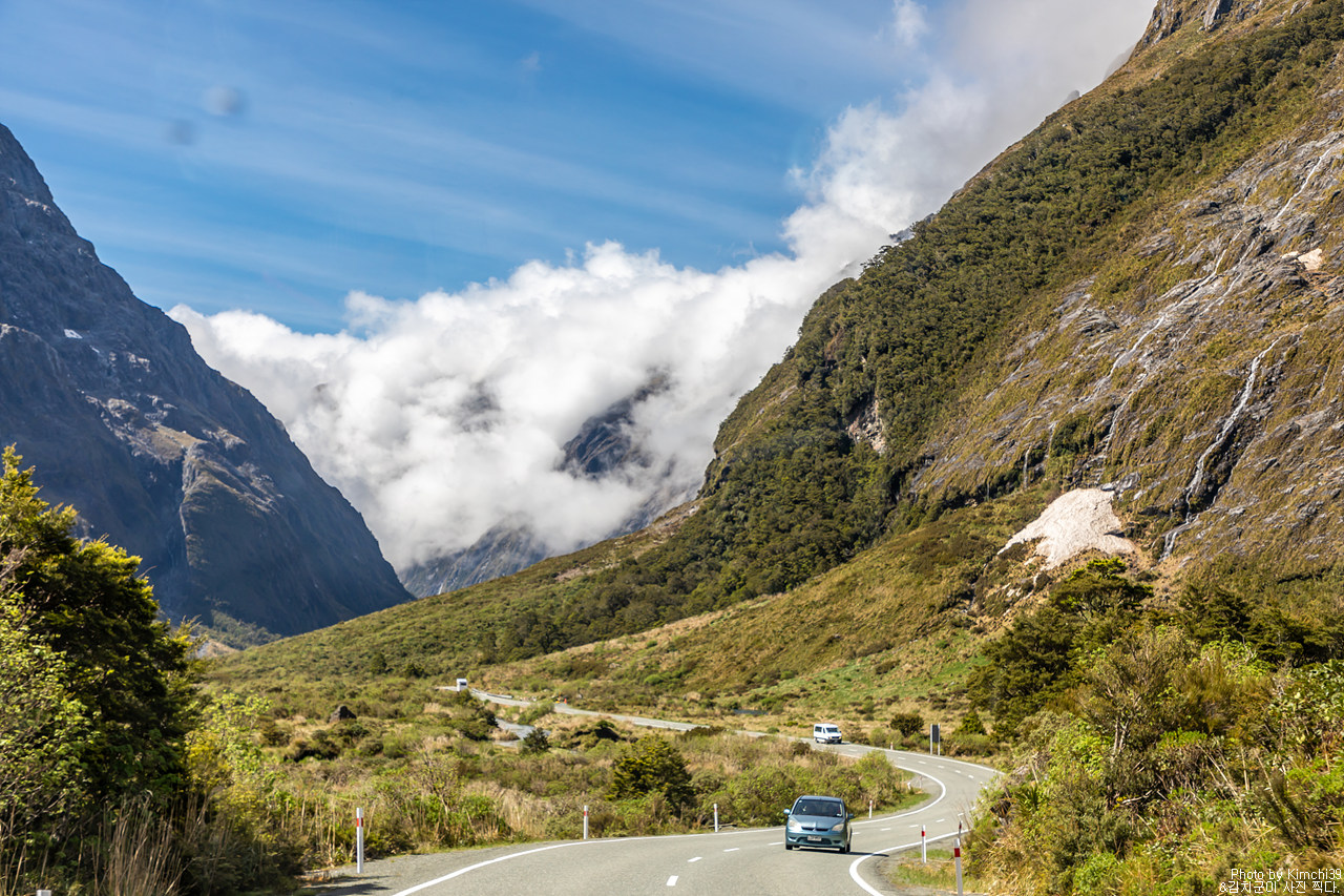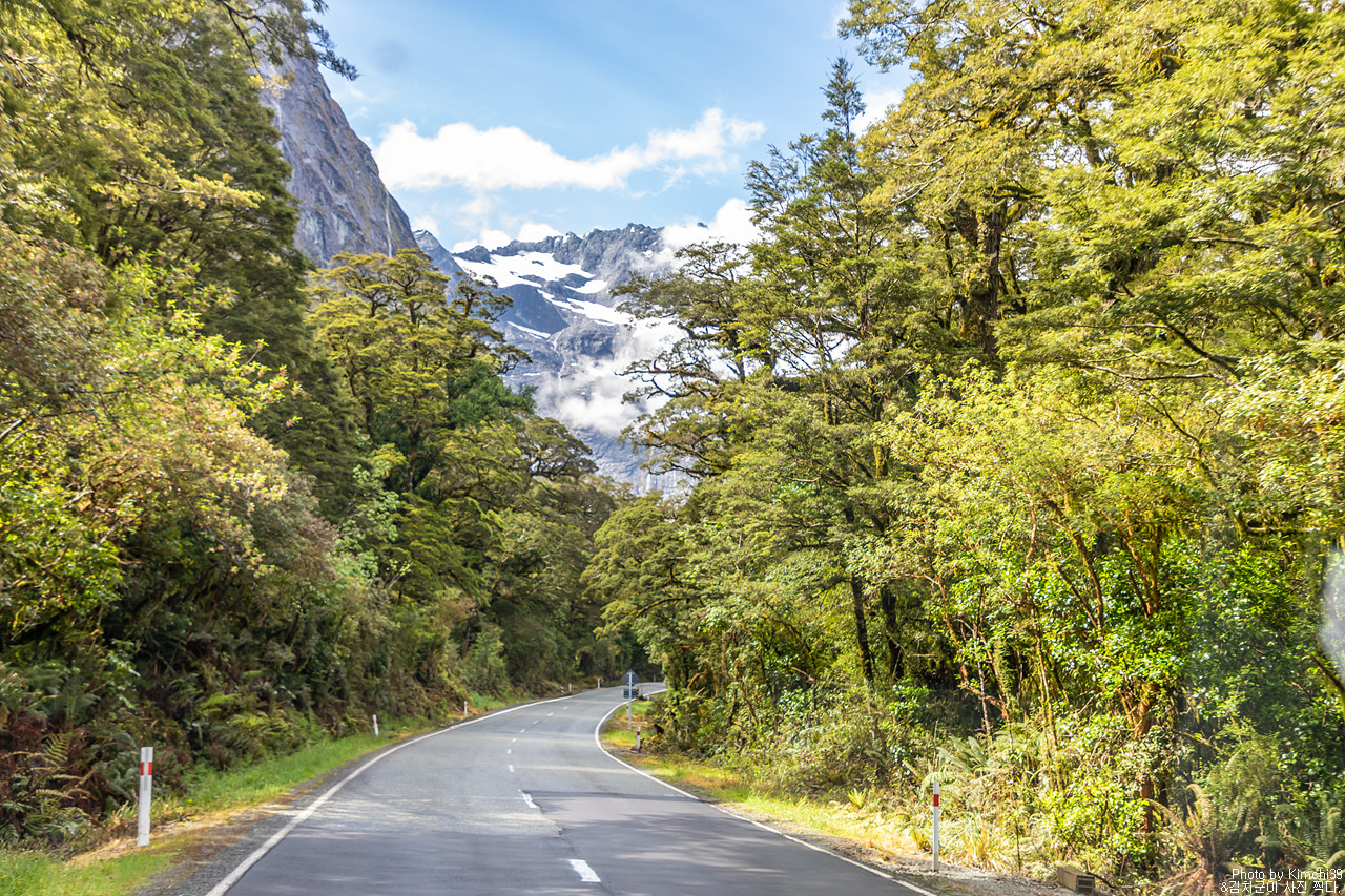 맑지만, 구름이 가득한 풍경. 그렇지만 그 구름이 설산을 다 가리는 것은 아니어서 그만으로도 충분히 괜찮은 풍경이 이어졌다. 누가 밀포드사운드 가는 길을 풍경이 별로라 했는가? 아, 생각해보니 폴스크릭을 지나는 순간부터 예쁘니, 전체로 봤을 때는 일부분처럼 느껴질 수는 있겠다.