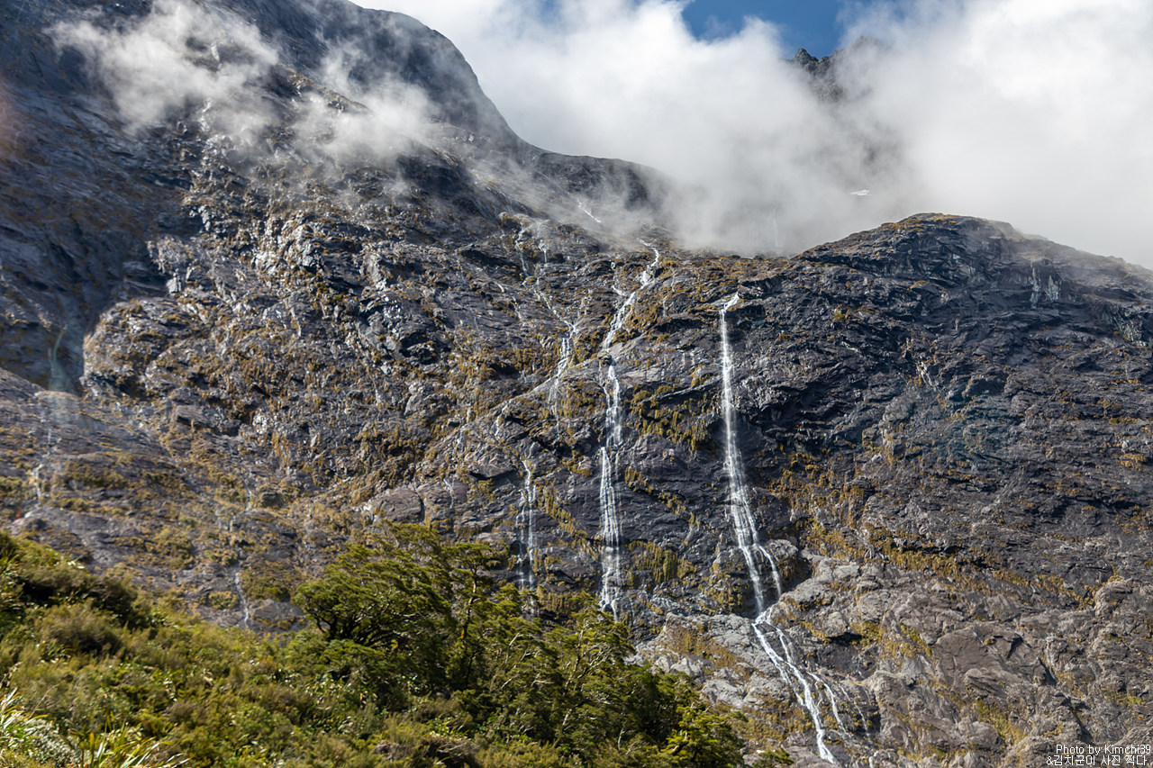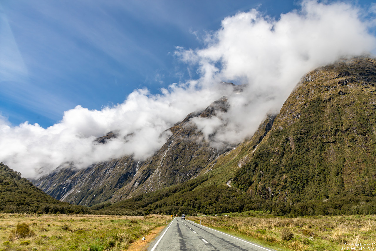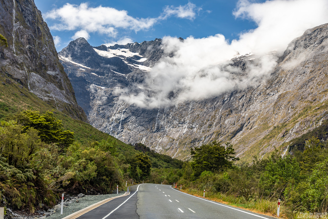 맑지만, 구름이 가득한 풍경. 그렇지만 그 구름이 설산을 다 가리는 것은 아니어서 그만으로도 충분히 괜찮은 풍경이 이어졌다. 누가 밀포드사운드 가는 길을 풍경이 별로라 했는가? 아, 생각해보니 폴스크릭을 지나는 순간부터 예쁘니, 전체로 봤을 때는 일부분처럼 느껴질 수는 있겠다.