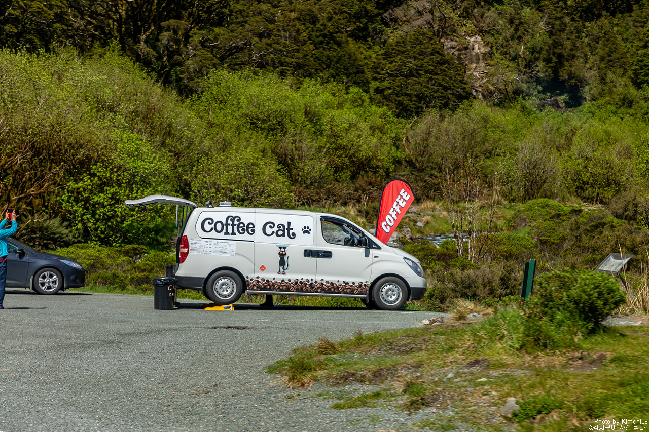 밀포드사운드 가는 길에는 정말 뭘 사먹을곳이 없는데, 이렇게 차에서 커피를 파는 곳이 있어서 커피를 사마셨다. 커피캣이라는 곳이었는데, 곳곳의 주차장마다 볼 수 있었다. 커피맛은 생각외로 괜찮은 편.