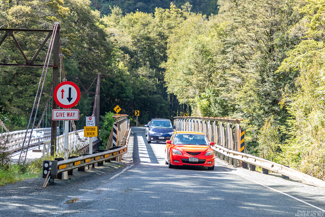 밀포드사운드에서 차를 돌려 다시 테아나우 방향으로 향했다. 이번에 만난 원웨이 브릿지는 반대쪽에서 오는 차가 우선. 내가 우선이 아닐때는 우선 멈춰서서 반대편에서 오는 차가 없는지 확인하고 가야 한다. 사진찍을땐 차가 지나가고 있지만, 사실 여기에 혹시나하고 멈추는 순간대 반대편에서 차가 커브를 틀며 나타났었다.