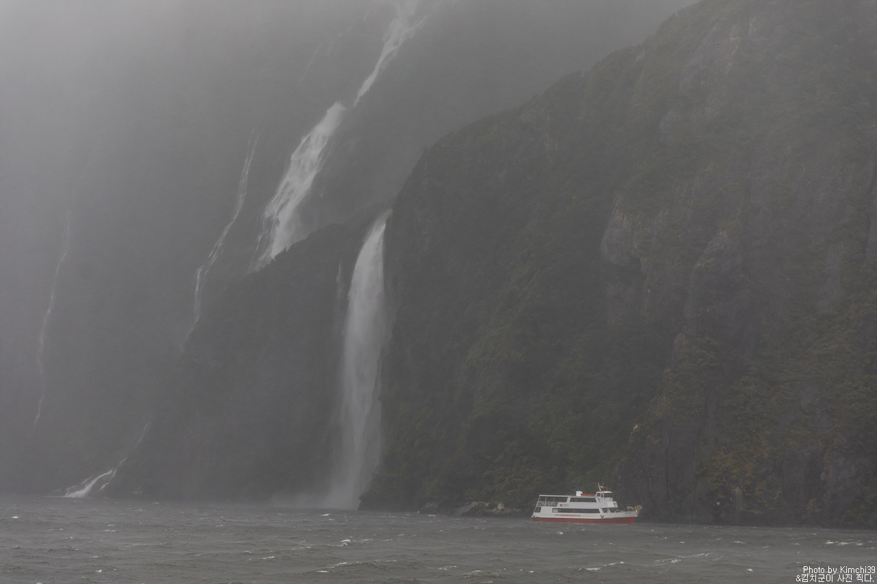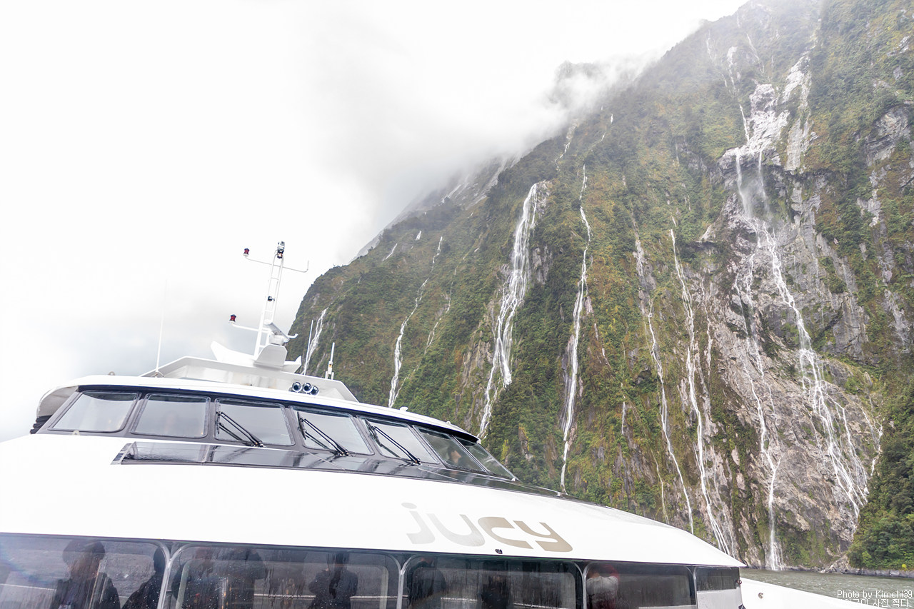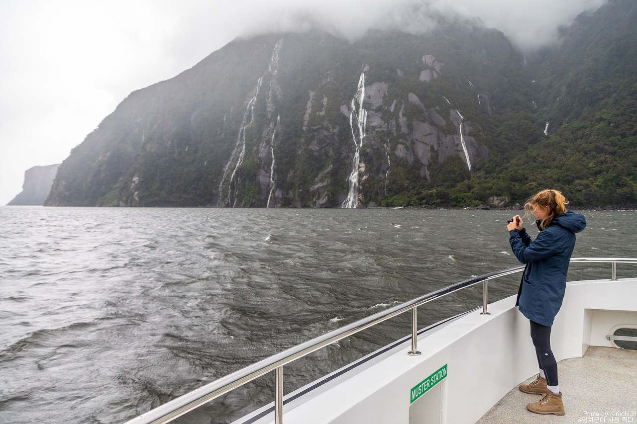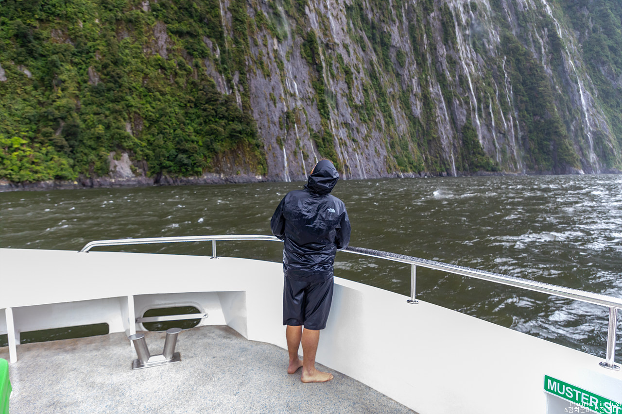 그렇게 밀포드사운드 쥬시 크루즈는 출발했고, 곧바로 비가 엄청나게 쏟아지기 시작했다. 아. 역시 비가 온다고는 했지만, 이렇게까지 많이 올 줄이야. 덕분에 모든 사람들이 배 안에서 머물렀지만, 역시 밖에서 비를 맞으며 감상하는 용자도 있었다.