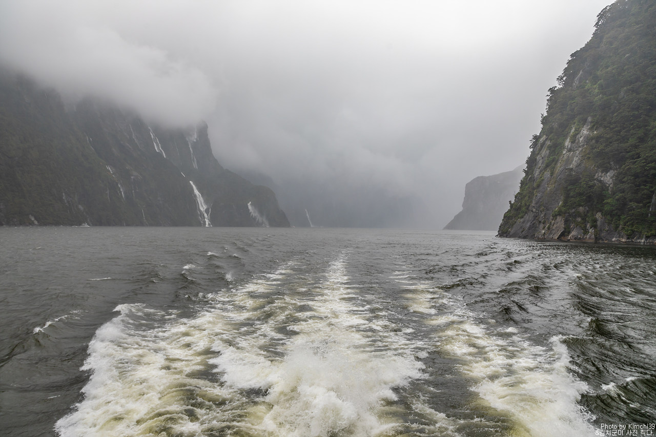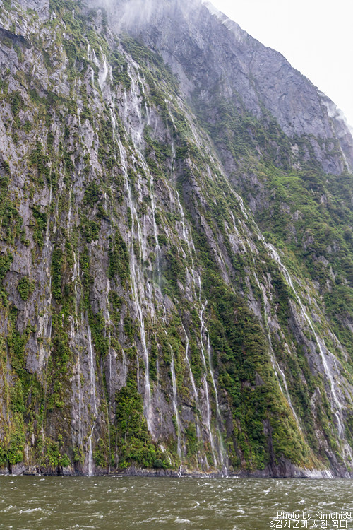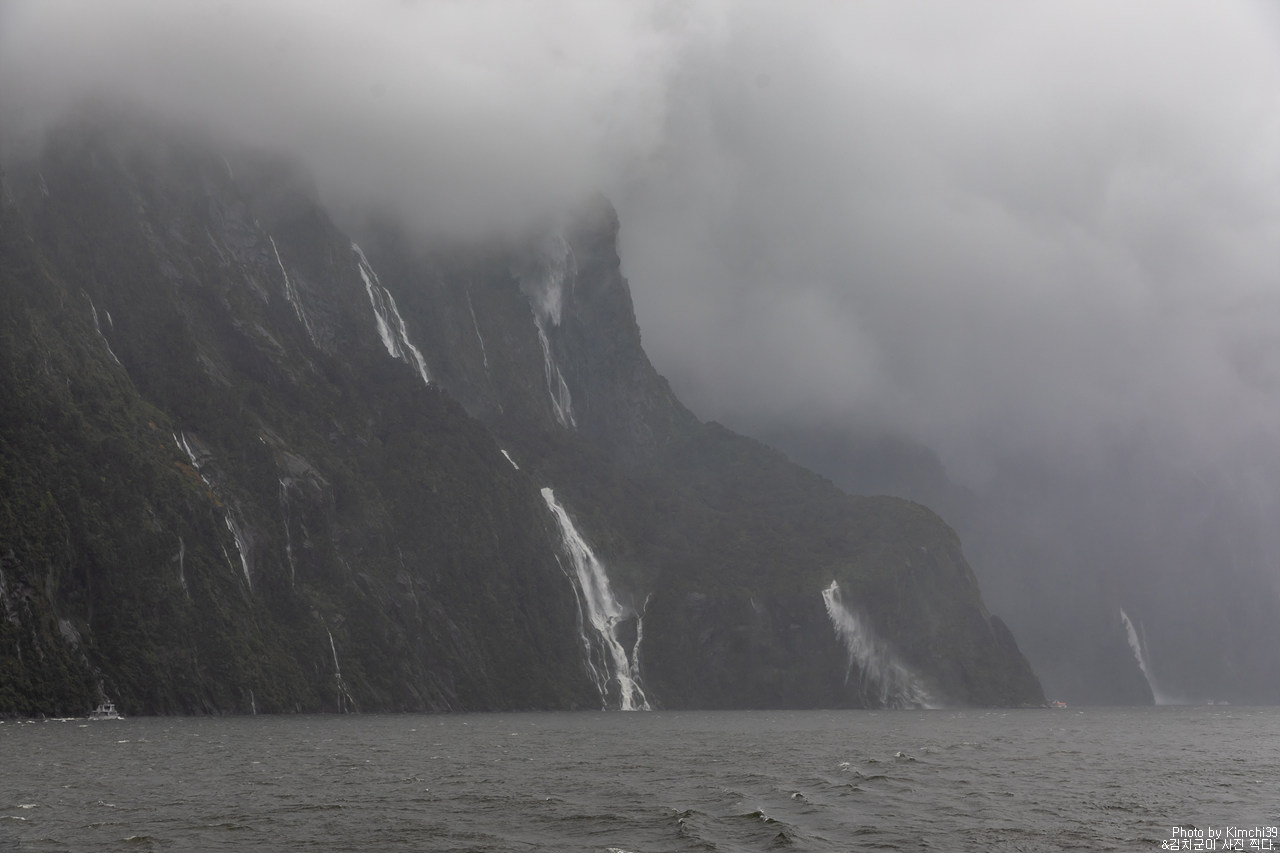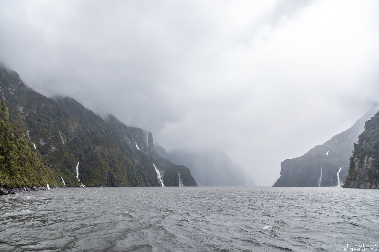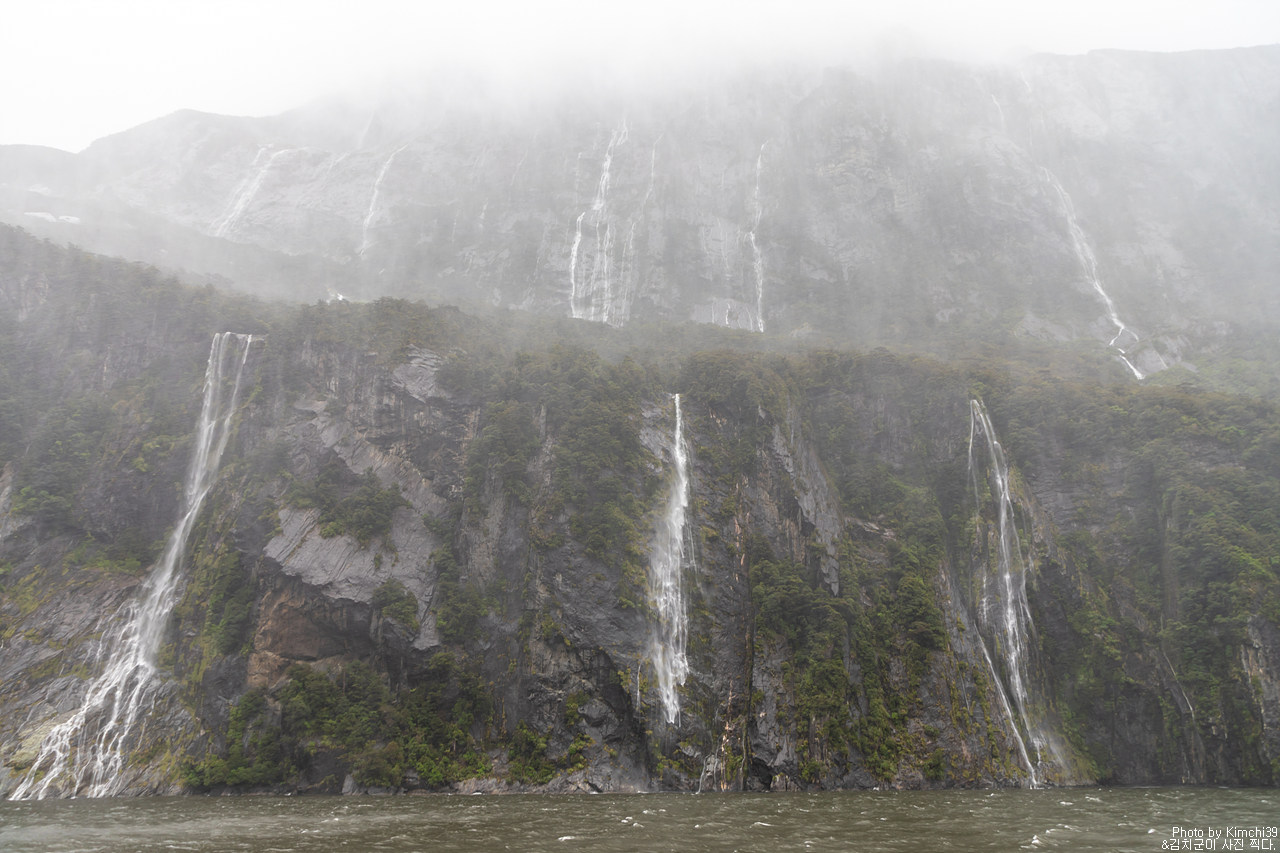 그렇게 밀포드사운드 쥬시 크루즈는 출발했고, 곧바로 비가 엄청나게 쏟아지기 시작했다. 아. 역시 비가 온다고는 했지만, 이렇게까지 많이 올 줄이야. 덕분에 모든 사람들이 배 안에서 머물렀지만, 역시 밖에서 비를 맞으며 감상하는 용자도 있었다.