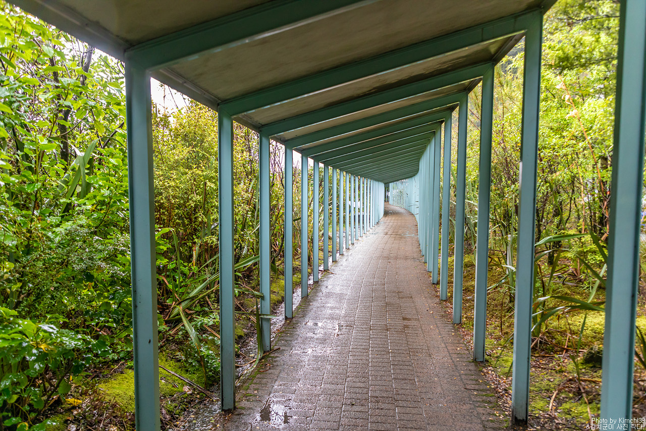 주차장에서 크루즈 터미널로 걸어가는 길. 나무가 가득한 보드웍을 걷다가, 포장된 지붕있는 길이 크루즈터미널까지 이어진다.