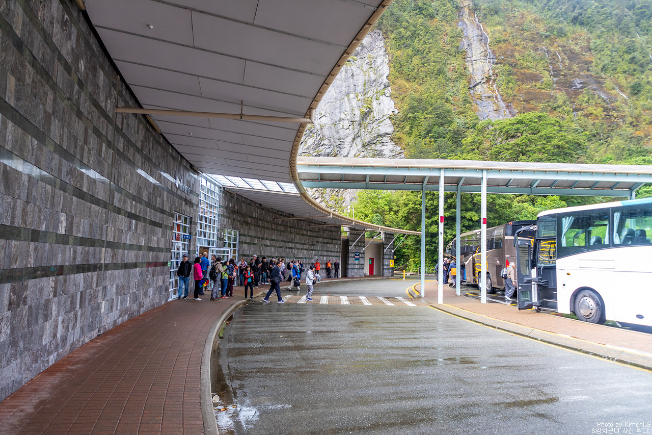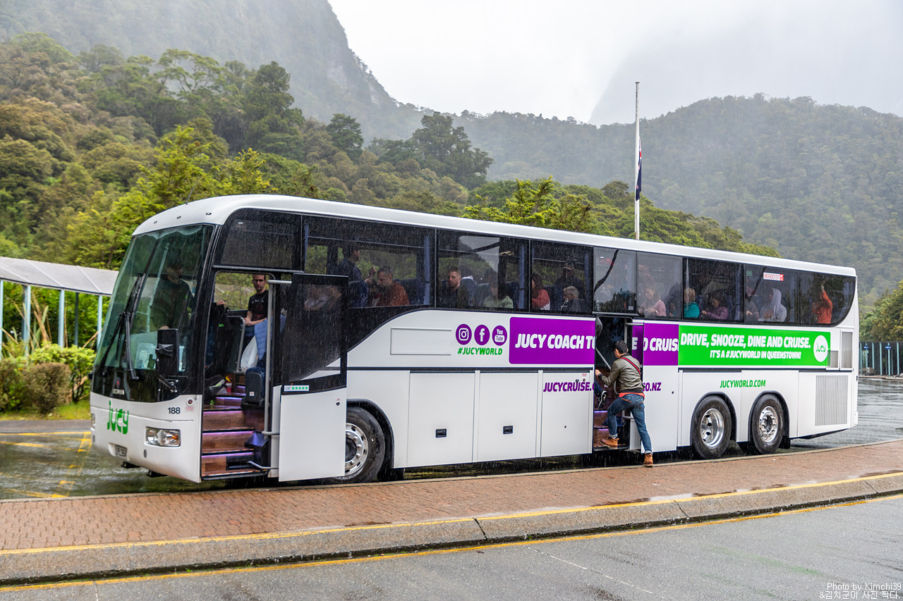 투어가 끝나고, 터미널 앞에 서있던 쥬시 버스. 그리고, 밀포드사운드.