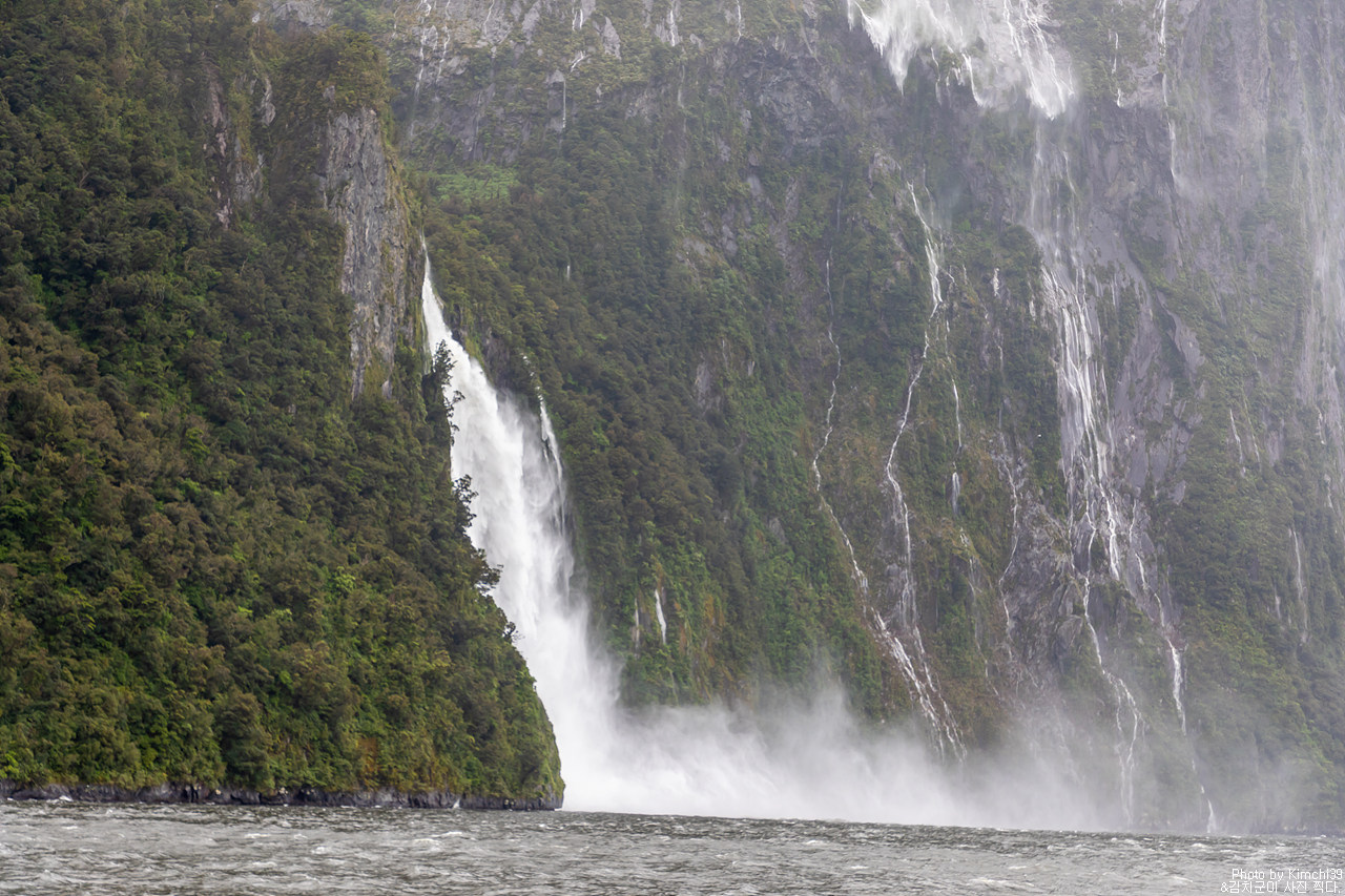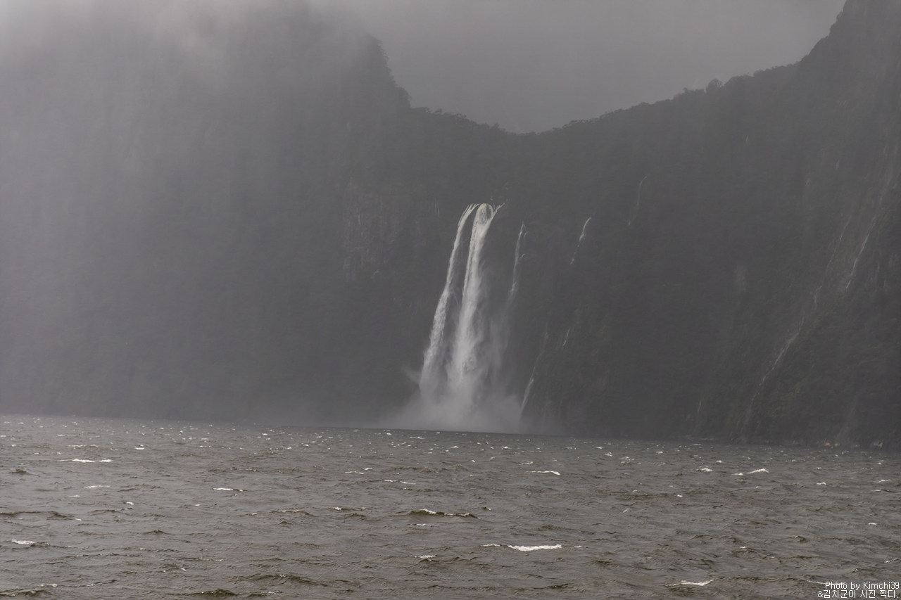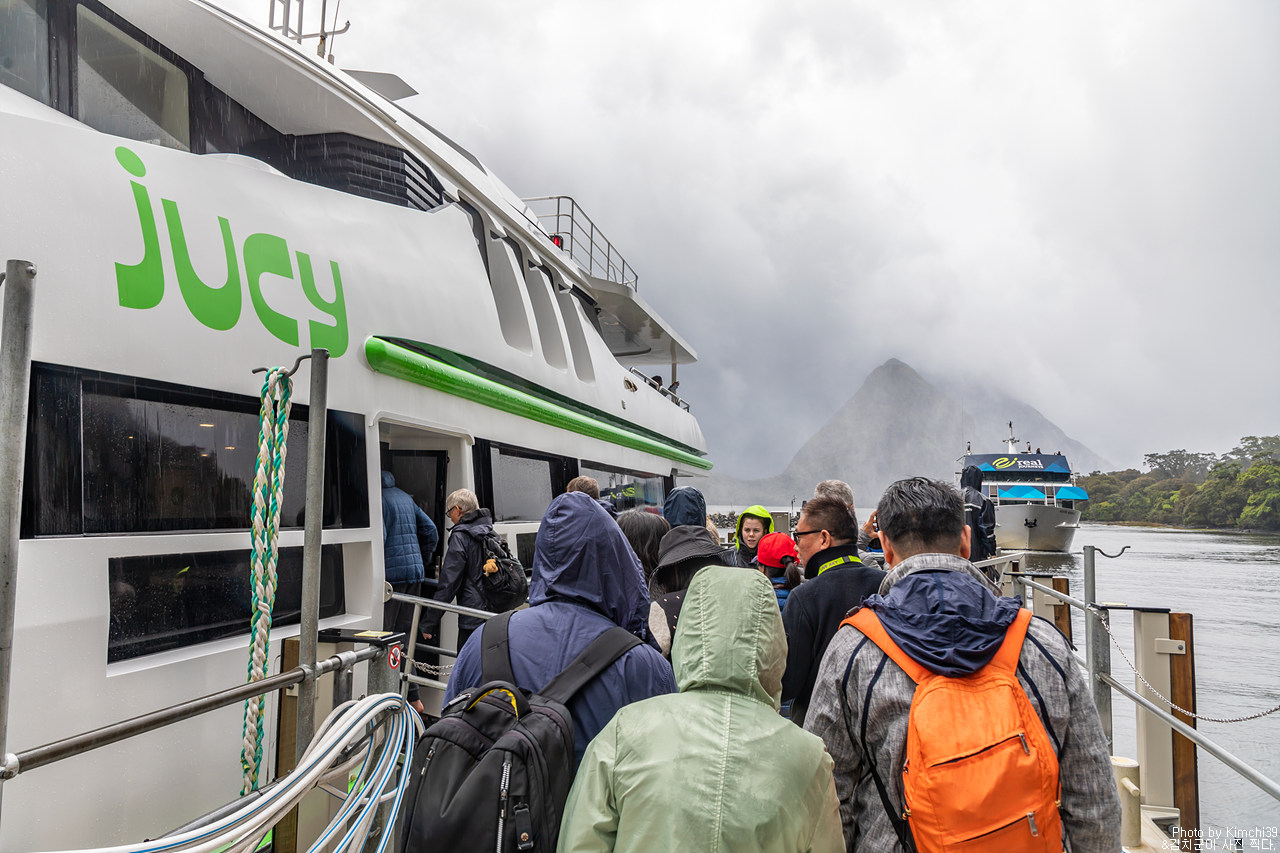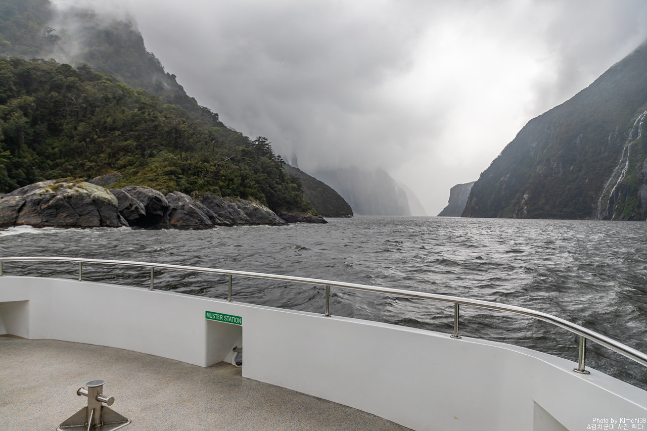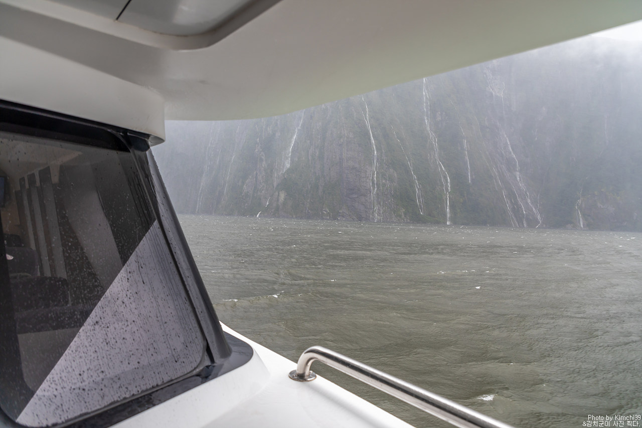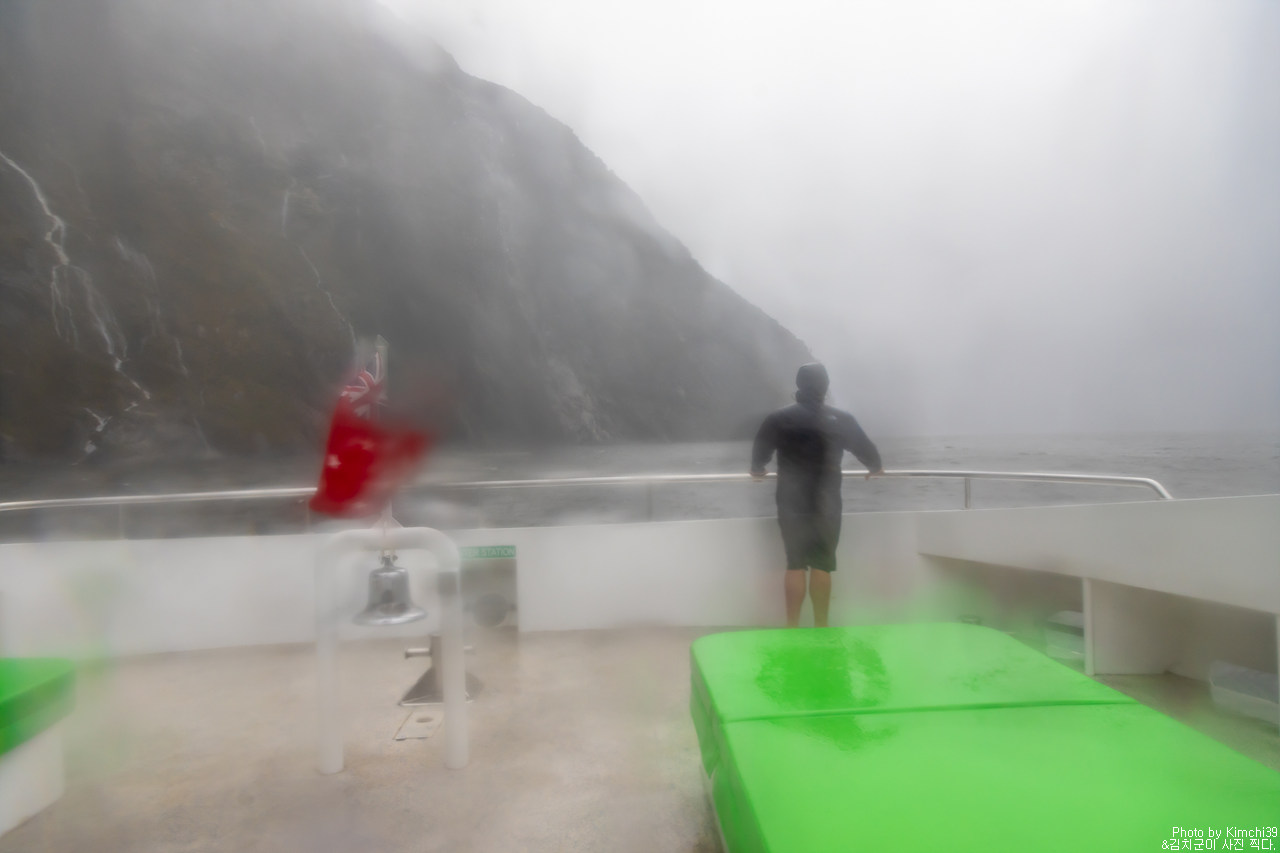 그렇게 밀포드사운드 쥬시 크루즈는 출발했고, 곧바로 비가 엄청나게 쏟아지기 시작했다. 아. 역시 비가 온다고는 했지만, 이렇게까지 많이 올 줄이야. 덕분에 모든 사람들이 배 안에서 머물렀지만, 역시 밖에서 비를 맞으며 감상하는 용자도 있었다.