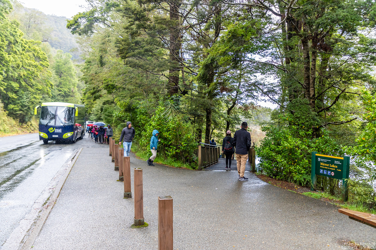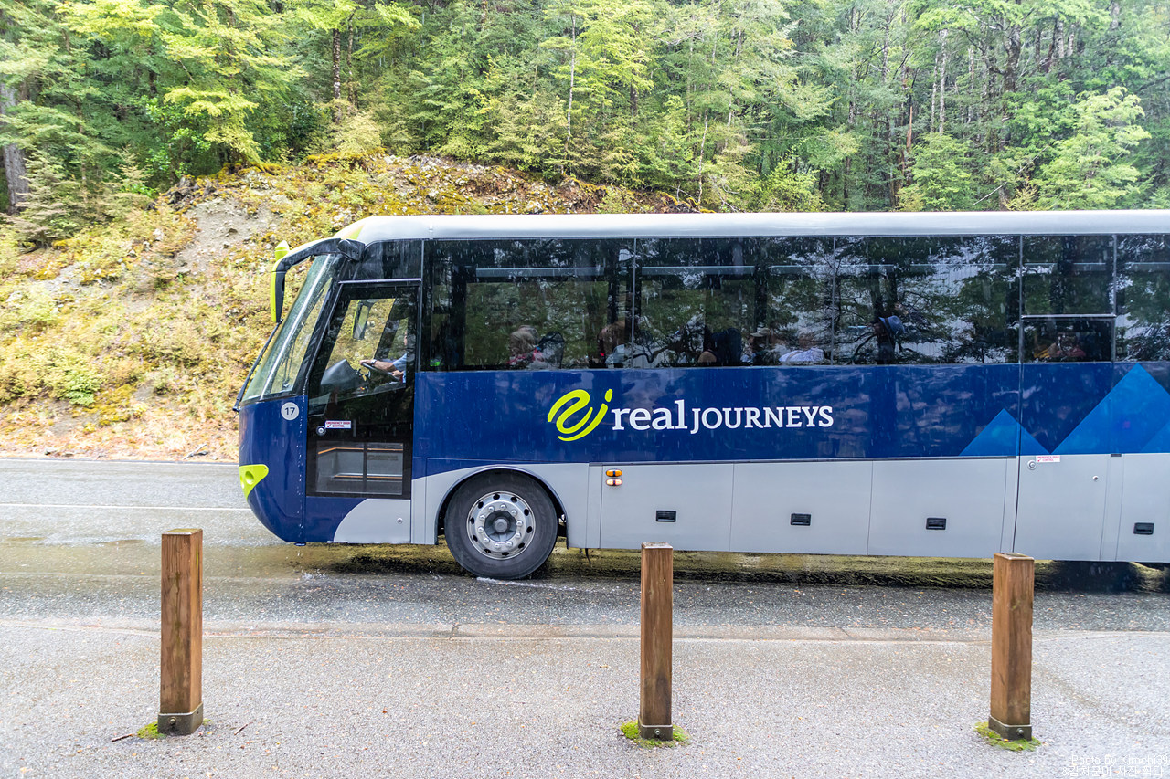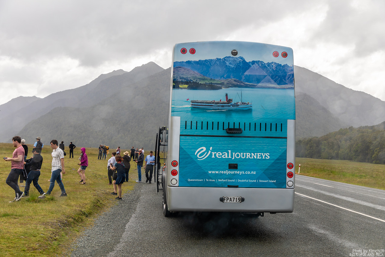 투어 회사 리얼 저니스의 버스. 제일 비싼 회사지만, 서비스도 가장 좋은편이라고. 그리고, 그 앞에는 밀포드 사운드 도로의 지도가 있었다. 투어 회사라면 정해진 3-4곳만을 서겠지만, 캠핑카 혹은 렌터카로 여행한다면 이 도로에는 생각보다 설 곳도 많고, 걸을 곳도 많다.