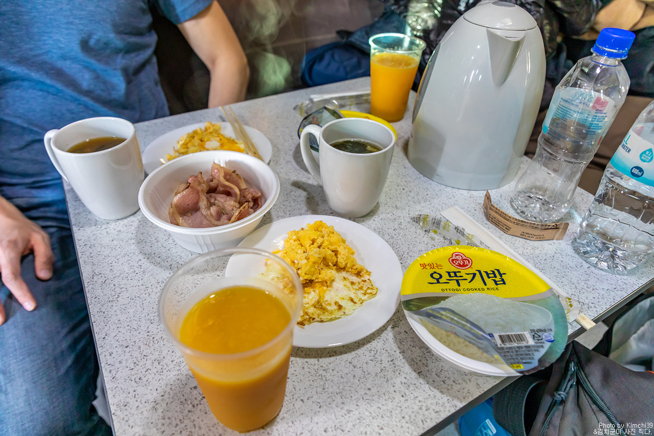 다음날 아침식사는 단촐하게 먹었다. 가볍게 베이컨과 계란후라이, 그리고 전자렌지에 오뚜기밥을 돌려먹었다. 오렌지주스와 커피는 곁다리. 이정도는 10분이면 준비가 가능하기 때문에, 사실 정말로 단촐한 식사라고 할 만 했다.