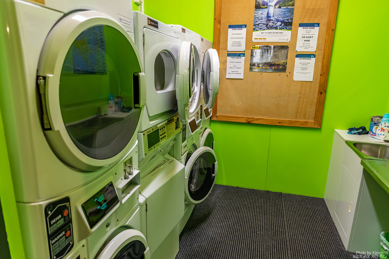 세탁실. 빨래 4 NZD, 드라이 4 NZD. 한번 빨래하는데 약 6천원 정도가 든다.