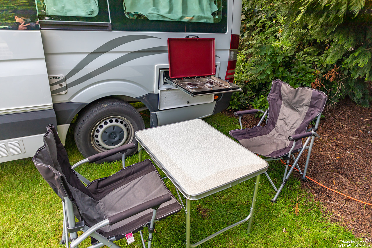 캠핑카 옆의 BBQ 그릴을 꺼내면 완성. 그리고, 인클루시브팩에 포함된 테이블과 캠핑의자를 꺼내서 세팅하면 바로 옆에서 굽고 동시에 먹을 수 있는 환경이 갖춰진다. 그렇다보니 고기를 구울때는 주방으로 가지 않고 차 옆에서 구워먹는 날이 많았다. 이렇게 홀리데이파크로 올 때에는 사실 주방이 있어서 요리 부담이 없지만, 화장실 정도밖에 없는 무료캠핑장으로 갈 경우에는 이런 조리방법이 도움이 많이 된다.
