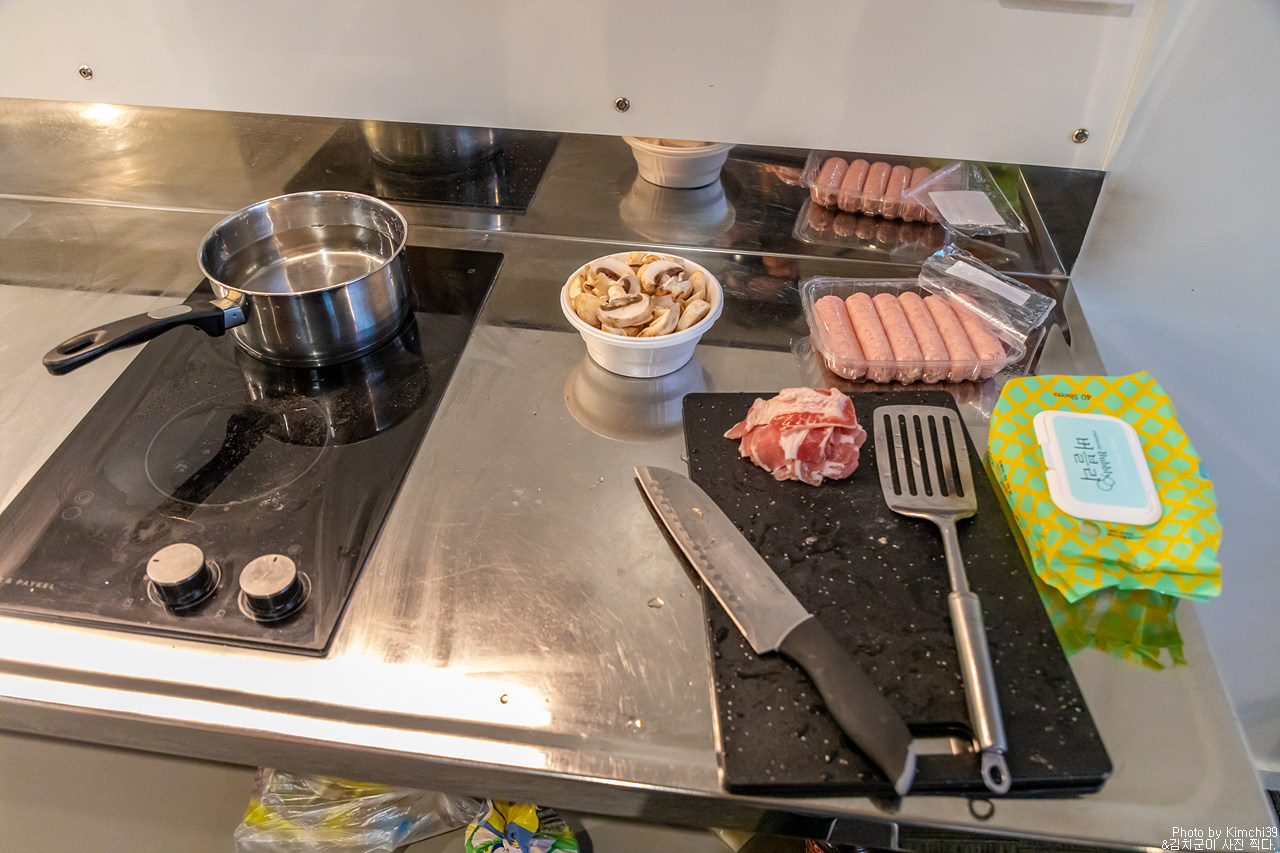 와나카 키위 홀리데이 파크의 주방. 오늘은 뭘 해먹을까 하다가, 소세지와 버섯, 그리고 베이컨을 베이스로 밥을 먹기로 했다. 소세지는 한번 삶은 다음에 구워줬고, 베이컨과 버섯은 그냥 바로 구웠다. 본격적으로 고기를 구울까 하다가, 시간이 너무 늦어져서 고기는 내일로 미루고 오늘은 간단하게 저녁을 먹었다. 어쨌든 그래도 고기인건 변함이 없지만.