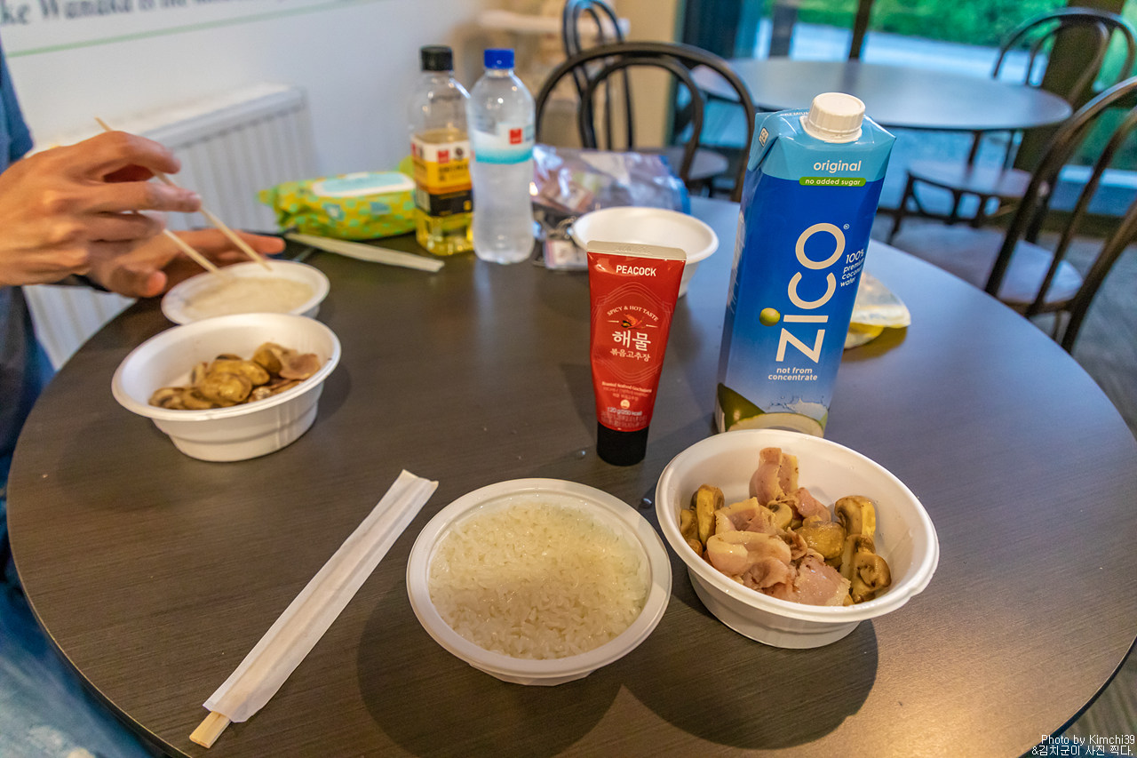 해물볶음고추장에 버섯, 베이컨, 소세지를 반찬으로 간단하게 먹었다. 김치도 있었어야 했으나, 김치를 짐싸는 날 냉장고에 두고 안가져와서 ㅠㅠ 그 후 슈퍼마켓에서 찾아봤으나 없어서 그냥 다녔다는 슬픈 이야기가..