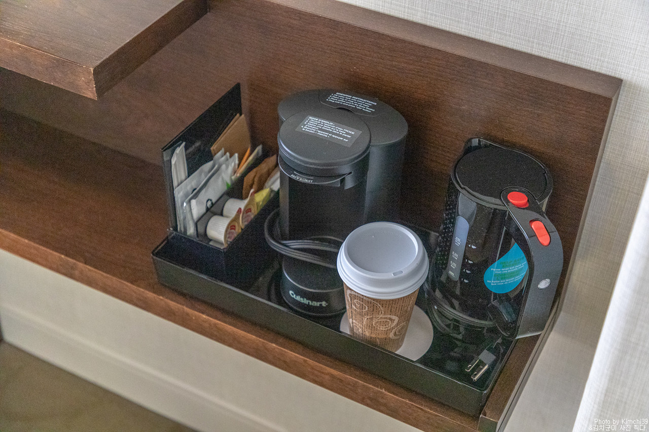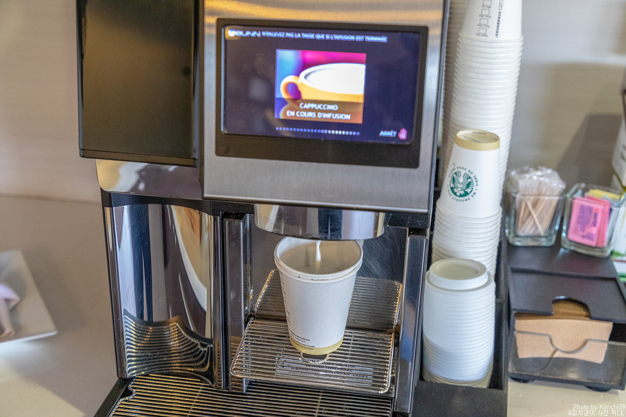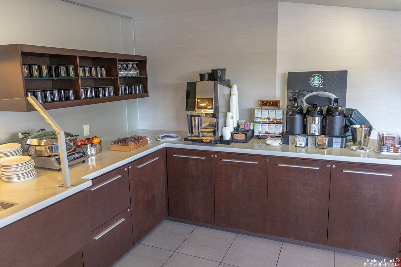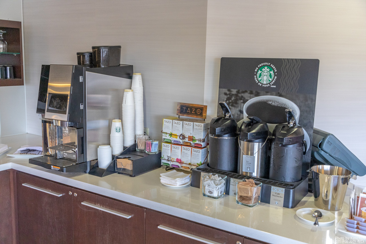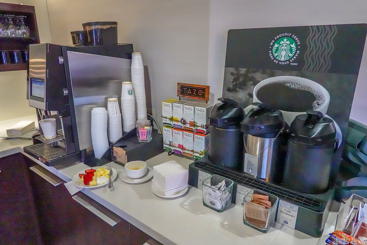 라운지의 커피메이커와 티. 내려져 있는 커피는 스타벅스 제품이었고, 티는 따조.. 커피메이커의 커피도 스타벅스라고 하는데, 뭐... 맞지 않을까 싶다.
