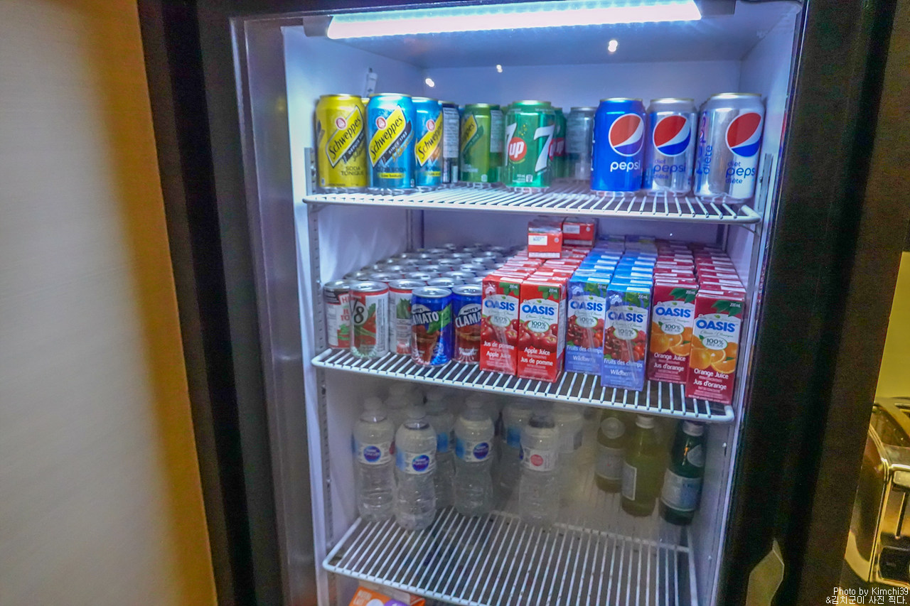 음료수들. 미국/캐나다 쪽의 라운지가 좋은 것이 음료 한두 개 정도는 들고나가도 크게 문제 삼지 않는다는 점이다. 덕분에 아침에 콜라 한 캔, 물 한 병 들고 나가서 돌아다니기에 좋다. 음료수를 한 병씩 사는 건 의외로 금액적인 부담이 있는데, 라운지가 있으면 이런 게 좋다.