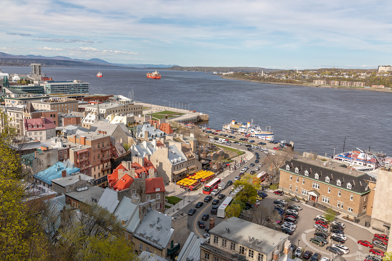 뒤프랭 테라스는 높은 곳에 위치해 있기 때문에 아래의 강과 타운 풍경을 내려다보기에 좋은 장소다. 그렇다 보니 난간에 기대서 풍경을 보는 사람들의 수도 꽤 많다. 퀘벡시티에서 가장 붐비는 장소 중에 하나가 아닐까 싶다. 이날에는 크루즈가 없었지만, 크루즈가 들어오는 날에는 정말 사람들이 어마어마하게 바글거릴 정도다.