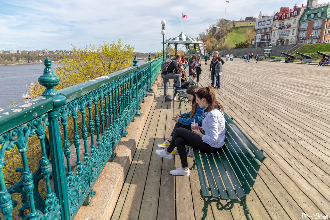 뒤프랭 테라스는 높은 곳에 위치해 있기 때문에 아래의 강과 타운 풍경을 내려다보기에 좋은 장소다. 그렇다 보니 난간에 기대서 풍경을 보는 사람들의 수도 꽤 많다. 퀘벡시티에서 가장 붐비는 장소 중에 하나가 아닐까 싶다. 이날에는 크루즈가 없었지만, 크루즈가 들어오는 날에는 정말 사람들이 어마어마하게 바글거릴 정도다.
