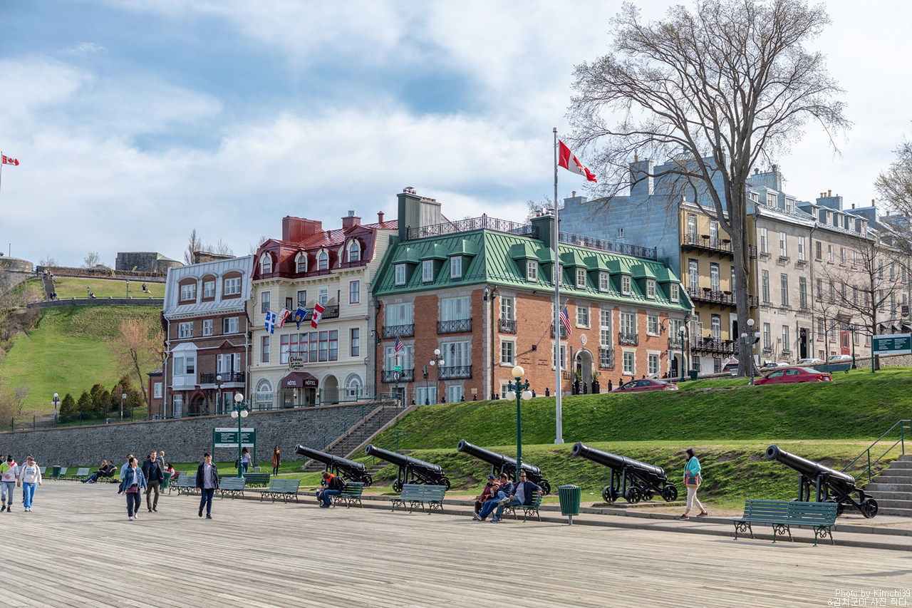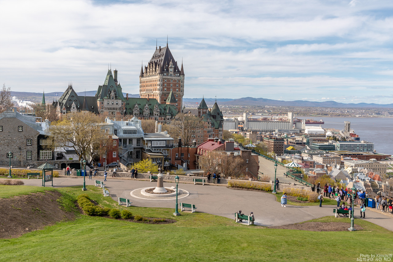 그렇게 길을 따라 올라가면 이렇게 도깨비 언덕에 도착하게 된다. 퀘벡시티에서 가장 멋진 뷰를 가진 포인트가 아닐까 싶다. 샤토 프롱트낙 호텔과 뒤프랭 테라스, 그리고 올드타운까지 한눈에 들어오기 때문이다. 그렇다 보니 낮에도 사람들로 북적이고, 해가 지는 시간대에도 일몰 시간대 풍경을 보기 위해서 사람들이 항상 많은 곳이다.