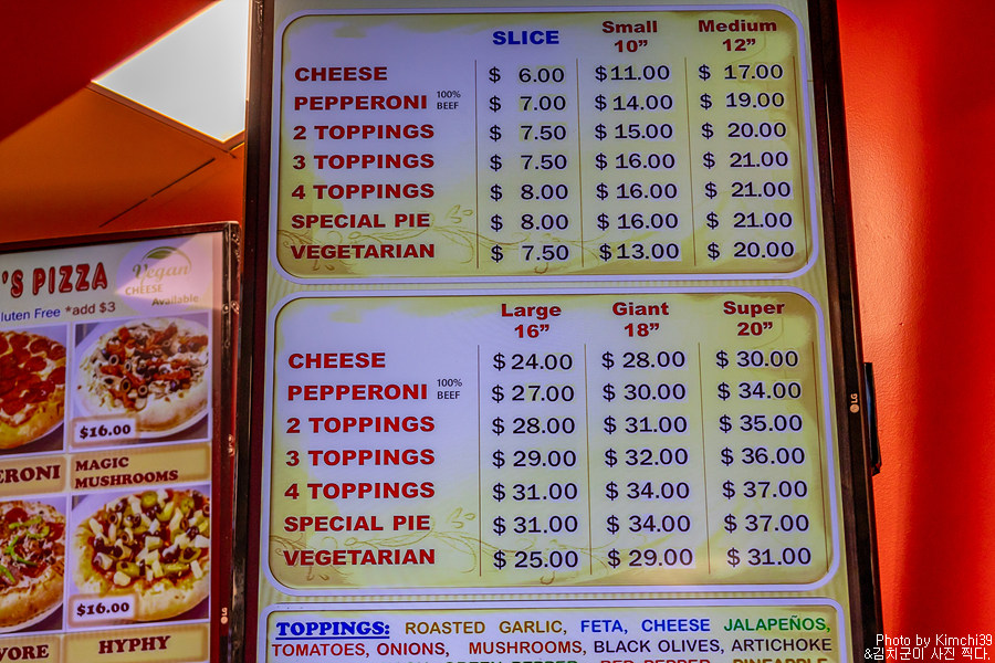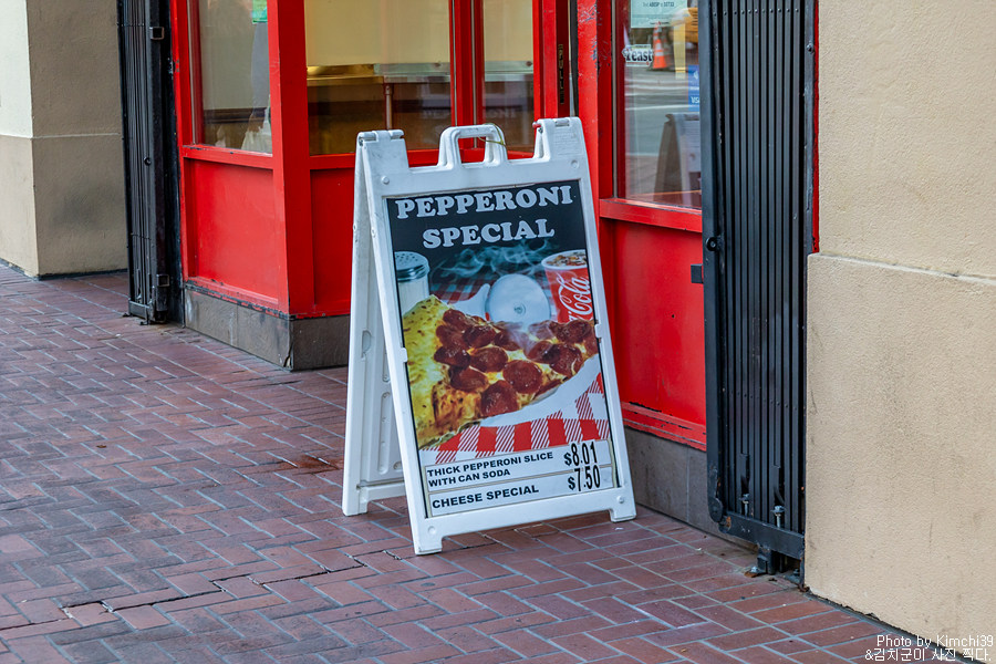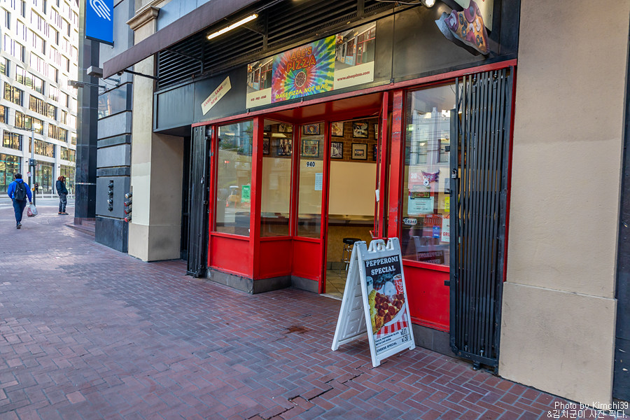 워낙 바쁘게 움직인 날이라 밥도 제대로 안 챙겨먹고 다녔었는데, 마침 근처에 페퍼로니 피자 1조각 + 소다에 $8.01 이라는 입간판이 보였다. 길거리에서 핫도그를 사먹을까 했었는데, 그래도 실내에 앉아서 먹는게 좋겠다 싶어서 안으로 들어갔다. 들어가고 나서 알았는데, 피자 가게 이름이 ABE's PIZZA였다.