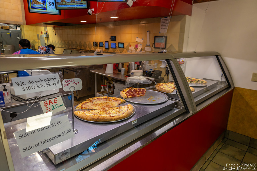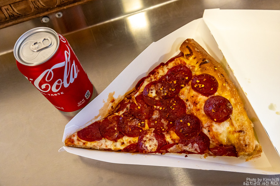 피자 1조각이라고는 했지만, 1조각 자체가 꽤 컸다. 콜라 뚱캔과 비교해보면, 피자 조각이 얼마나 큰지 대충 짐작이 가지 않을까? 뭐, 조각피자가 그렇듯이 피자 자체는 꽤 먹을만 했다. 고르자마자 다시 데워서 줬기 때문에 피자도 따뜻하고 치즈도 잘 늘어났으니까. 예전에는 이런 피자 한조각에 $3~4면 먹었던거 같은데, 가격이 참 많이 올랐다.