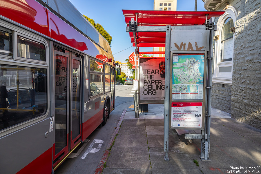 그랜드뷰 공원에서 내려올 때만 하더라도, 마켓스트리트로 바로 갈 예정이었지만.. 버스 루트를 보다가 중간에 알라모 스퀘어(Alamo Square)에 들리는 것으로 일정을 바꿨다. 덕분에 타고가던 버스에서 내려서 한 번 버스를 갈아타고 알라모 스퀘어로 향했다. 사실, 그냥 타고가던 버스를 그냥 타도 되긴 했는데, 그러면 언덕을 걸어올라가야 해서 바로 앞까지 가는 버스를 타기로 했다. 뭐, 갈아타는 버스를 10분 정도 기다렸으니, 최종 도착시간은 큰 차이가 없었을 것 같지만.