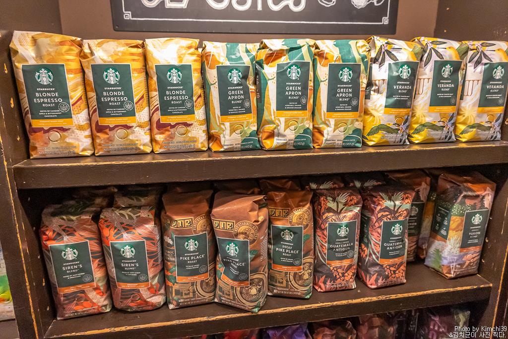내부에서는 원두부터 다양한 굿즈들을 팔고 있었지만, 딱히 손이 가는 것은 없었다. 집에도 이미 남아도는 것이 텀블러(스벅 것들도 포함..)고, 머그는 딱히 모으는 편이 아니라서..ㅎㅎ 그래서 가볍게 음료만 사가지고 나오기로 했다. 스타벅스1호점은 기본적으로 들어가자마자 음료 또는 상품들을 주문하고.. 기다렸다가 받아서 나오는 그런 시스템이다. 그래서 대기줄과 주문줄이 따로 있고, 공간이 협소하다보니 앉을 자리도 없다. 조금 넓고 볼거리가 있는 곳을 찾는 다면 캐피톨힐쪽에 있는 스타벅스 리저브 로스터리(Starbuck Reserve Roastery)로 가는 것을 추천한다. 시애틀의 로스터리가 진짜 잘 해놨으니까.