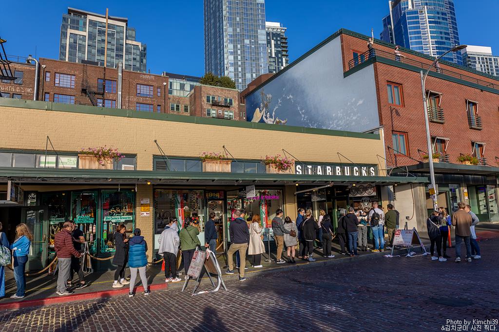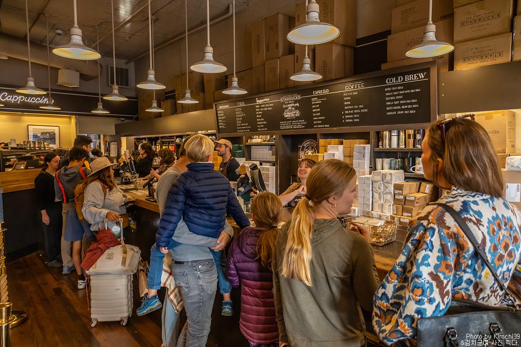 대략적으로 이정도의 줄? 어차피 앉을곳도 없고, 음료나 굿즈를 사고 나오는 것이 전부이기 때문에 실제 대기시간은 15분 정도였다. 스타벅스가 뭐라고 아직도 줄서서 들어가냐고 하지만, 그래도 시애틀에 왔다면 이 1호점과 스타벅스 로스터리는 한 번쯤 가봐야 하는 곳이니까.