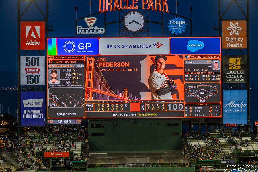오라클파크 3층에서 보이는 풍경. 바로 오른쪽에 바다가 펼쳐지는 꽤 멋진 느낌의 구장이다. 사실, 경기보다 이 풍경을 보고 싶어서 오라클파크에 왔다고 해도 과언이 아니었다. 샌프란시스코 자이언츠 경기는 덤.. 근데, 1회부터 두드려 맞더니 무려 5점이나 실점을 했다. 아, 오늘 샌프란시스코 패배각이 보인다.