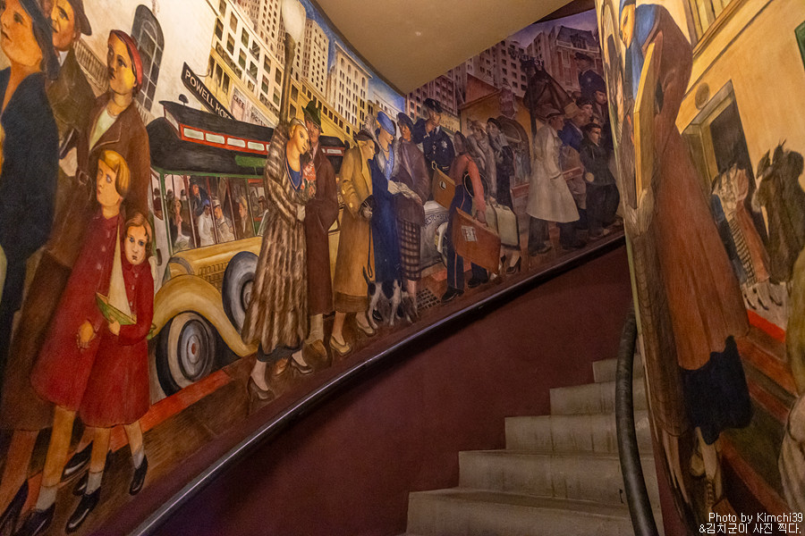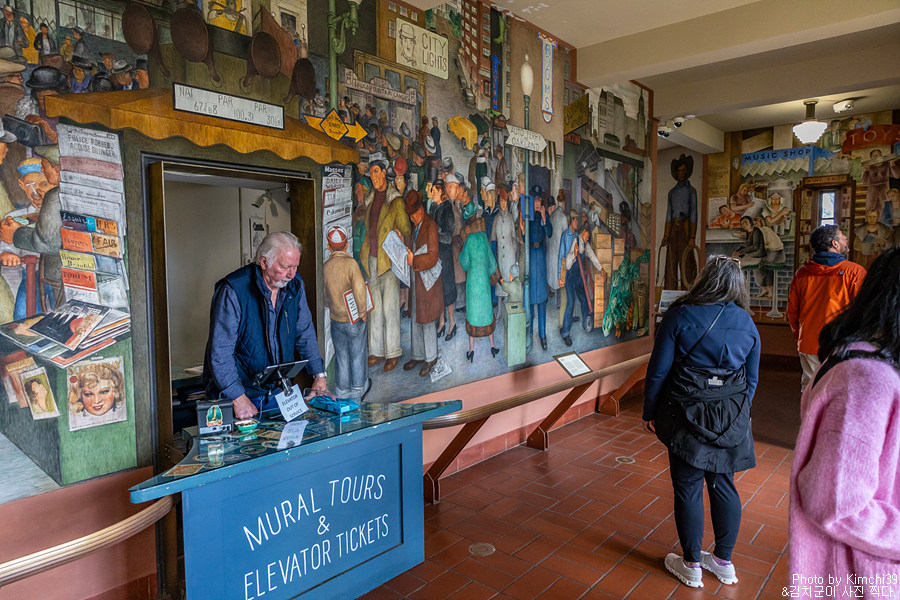 코잇타워의 1층에는 이렇게 많은 벽화들이 그려져 있는데, 이 벽화들은 별도의 비용 없이 둘러볼 수 있도록 되어 있다. 이 벽화들은 공공 예술 프로젝트로 1934년에 대공황 당시의 캘리포니아 삶에 대한 그림들이어서 어느정도 급진적인 묘사들이 있다. 1층 외에도 2층으로 올라가는 유료 공간에도 벽화가 있다.