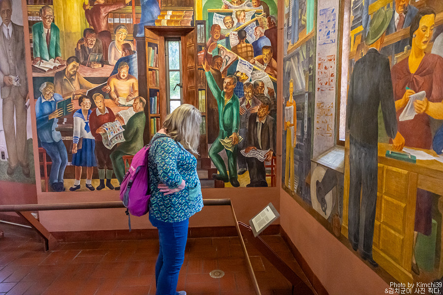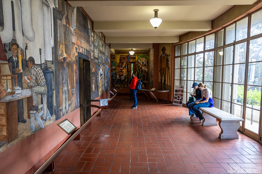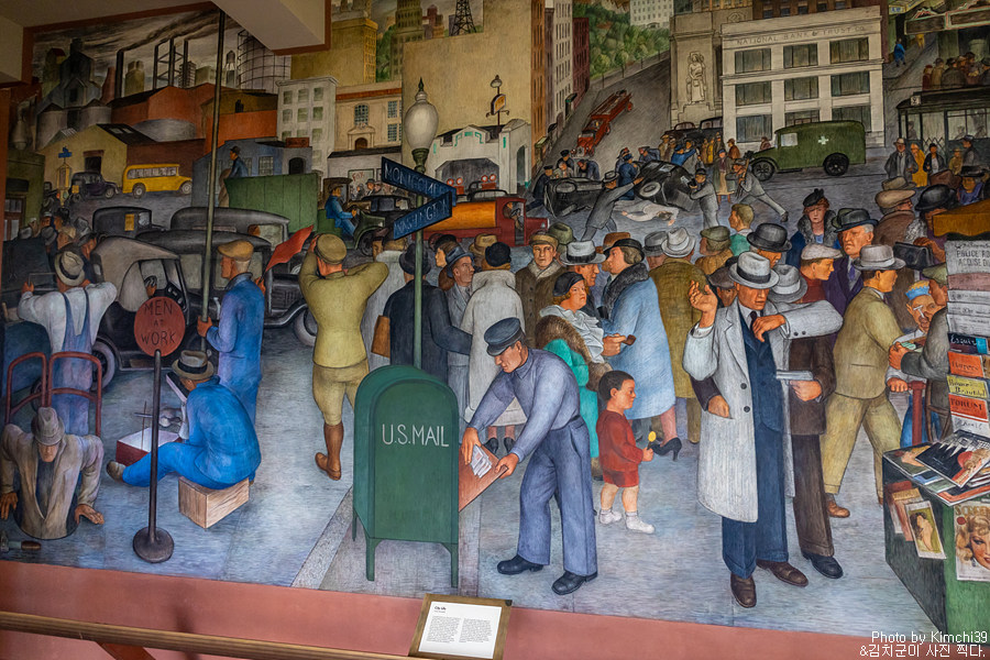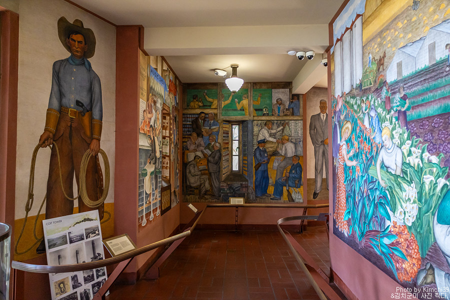 코잇타워의 1층에는 이렇게 많은 벽화들이 그려져 있는데, 이 벽화들은 별도의 비용 없이 둘러볼 수 있도록 되어 있다. 이 벽화들은 공공 예술 프로젝트로 1934년에 대공황 당시의 캘리포니아 삶에 대한 그림들이어서 어느정도 급진적인 묘사들이 있다. 1층 외에도 2층으로 올라가는 유료 공간에도 벽화가 있다.