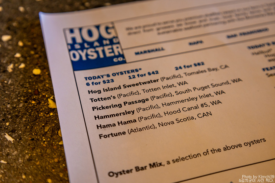먼저, 여기 온 이유 중 하나였던 굴부터. 6개에 $23, 12개에 $42였다. 한국의 굴 가격을 생각하면 가격이 상당히 세기는 하지만, 그래도 뭐.. 단일화 된 굴이 아니라 여러가지 종류의 굴을 먹어볼 수 있다는 장점이 있긴 했다. 여러명이라면 더즌을 시켜놓고 먹었겠지만, 혼자니까 하프더즌(6개)만.