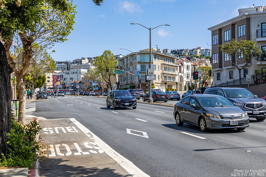 버스타고 이동하는 길. 샌프란시스코의 뮤니 버스는 여전히 차에 위치해있는 줄을 당기면 스톱사인이 켜지는 방식이었다. 나는 45번 버스를 타고 Union St & Baker St 에서 내렸다. 리옹스트리트 스텝스로 가는 버스는 여러 노선이 있는데, 유니언 스퀘어에서 한번에 갈 수 있는 건 45번 버스다. 대신 내린 곳에서 좀 걸어올라가야 하는 단점이 있다.