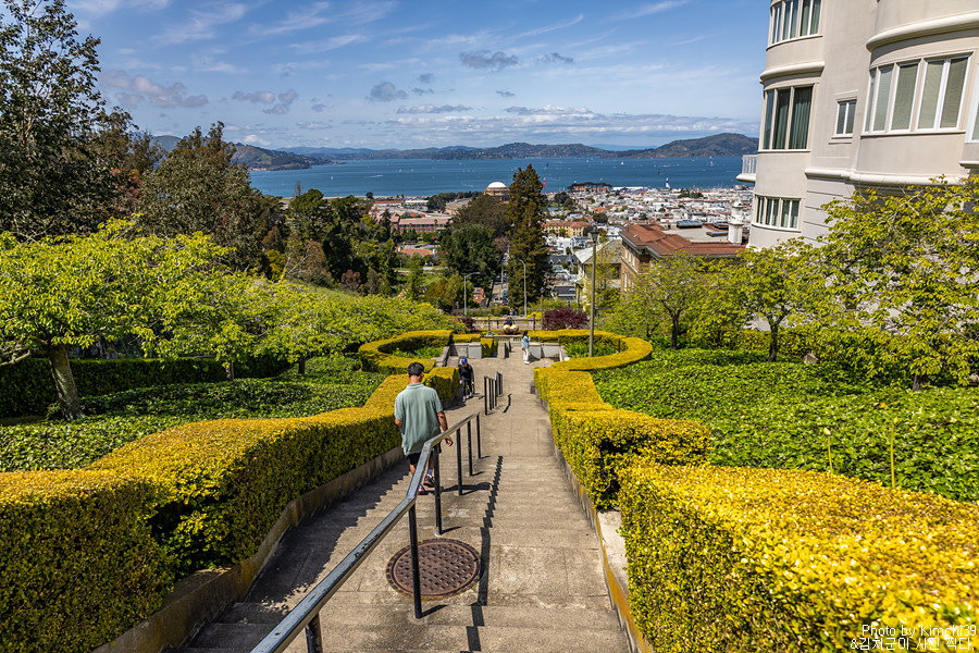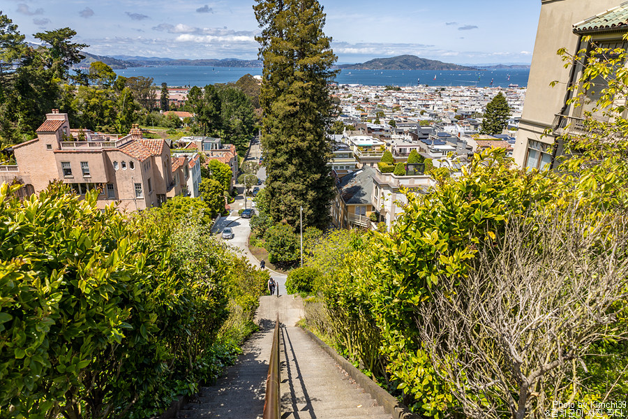 리옹 스트리트 스텝스 정상에서 본 샌프란시스코 풍경. 여기서 보이는 풍경도 멋지지만, 아래 포디움에서 하트와 함께 보는 풍경도 예쁘다. 여기서 프레시디오(Presidio)로 들어가는 입구가 있다.