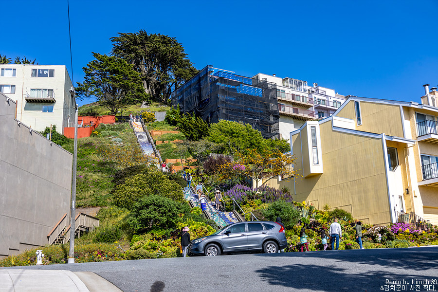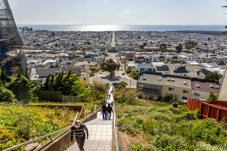 16번가 타일드 스텝스에 다 오르면 이런 풍경이 펼쳐진다. 샌프란시스코의 다른 풍경들과 다르게, 언덕에서 내려다보이는 풍경이 평평하고 멀리 바다까지 보인다. 조금 색다른 느낌.