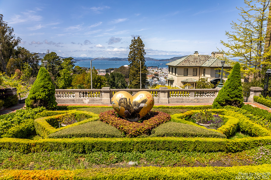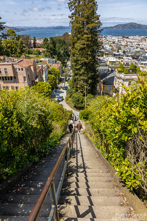 리옹 스트리트 스텝스 정상에서 본 샌프란시스코 풍경. 여기서 보이는 풍경도 멋지지만, 아래 포디움에서 하트와 함께 보는 풍경도 예쁘다. 여기서 프레시디오(Presidio)로 들어가는 입구가 있다.