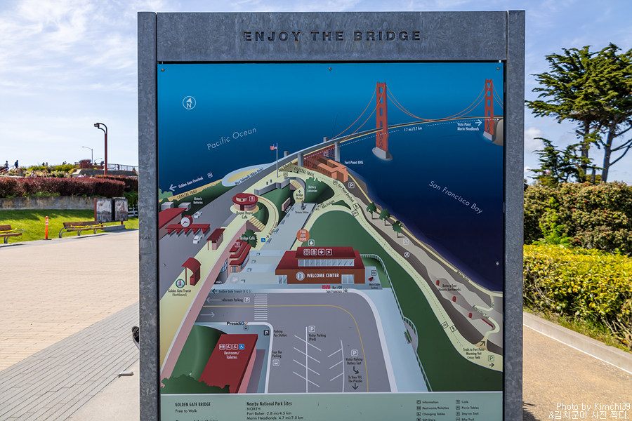 금문교 웰컴센터는 금문교 전망대 중 가장 유명한 곳이다. 매일 오전 7시부터 저녁 9시까지 주차비를 받으며, 15분당 무려 $1.25나 하기 때문에 차를 가지고 왔다면 정말 30분 정도 사진만 찍으러 머무르는 사람들도 많다. 주차장에서 전망 포인트까지는 걸어서 5분도 안걸리기 때문에 사실 30분만에도 충분히 사진을 찍고 올 수 있긴 하다. 또한, 웰컴센터 내에서는 여러 기념품도 구매가 가능하고, 간단한 전시도 있으므로 시간이 된다면 들어가 봐도 좋다.