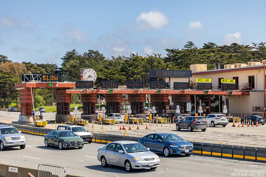 걸어가면서 볼 수 있는 금문교의 톨게이트. 참고로 샌프란시스코를 빠져나갈 때에는 톨비를 내지 않지만, 샌프란시스코로 들어올 때에는 금문교 톨비를 내야 한다. 렌터카의 경우 렌터카 자체의 톨비 지불 시스템을 사용하면 편리하지만, 추가요금을 내야 하므로 금액을 아끼려면 사전에 차량 등록을 해 두는 것이 좋다. 방법은 아래 글 참고.