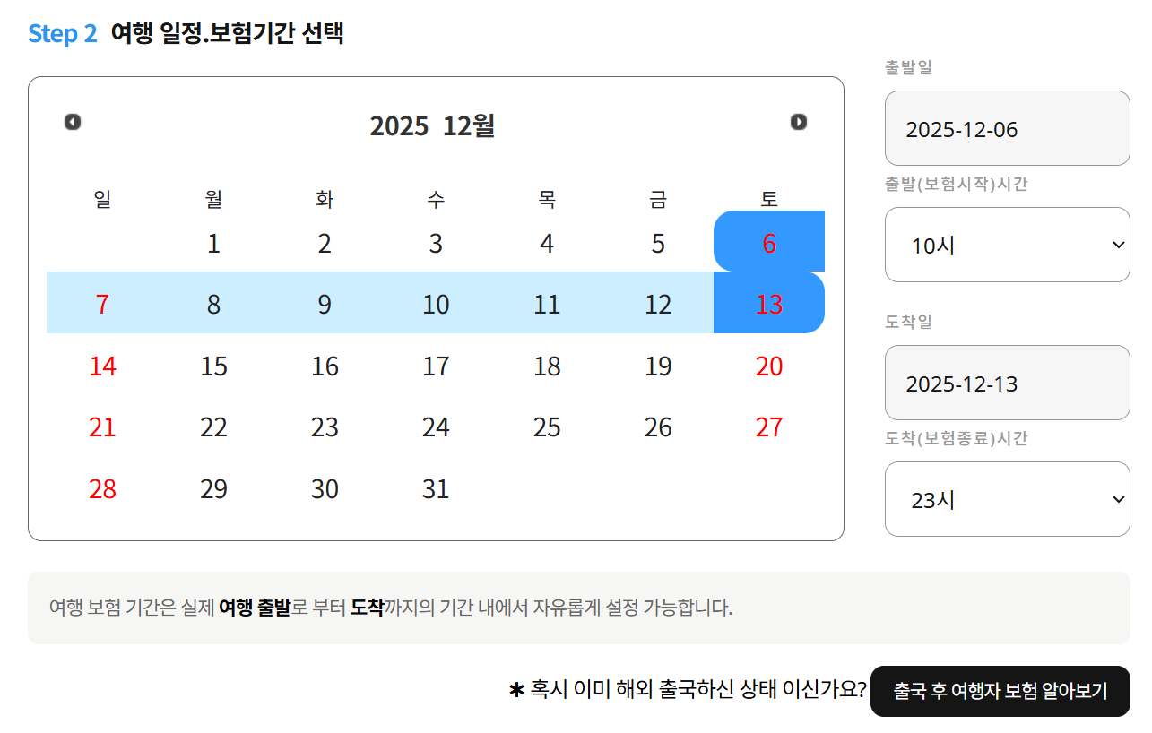 또 한가지 주의해야 하는 것은 한국을 떠나 해외에 있을 때에는 여행자보험 가입이 불가능하므로, 꼭 한국에 있을 때 가입 해야한다는 것이다. 해외에서 가입했을 경우에는, 보험 보장을 받을 수 있다. 물론, 가입과정에 한국에 있는지를 묻는 부분이 있으므로 사실 가입은 불가능하다고 봐야 하지만. 보험 가입 시간은 그냥 집에서 출발하는 시간과 도착하는 시간으로 하면 무방하다.