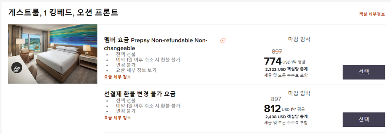 오션프론트 룸은 총 $2,322 으로 약 3,097,548원인 만큼 더 큰 차이가 난다.